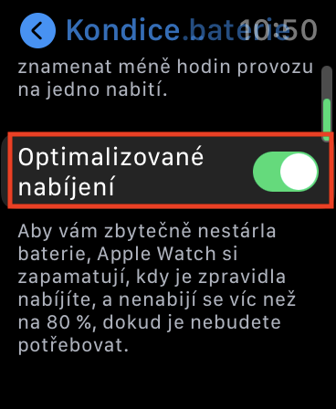 Tímto způsobem můžete na vašich Apple Watch (de)aktivovat Optimalizované nabíjení baterie. Jestliže o této funkci slyšíte poprvé, tak jak už jsem zmínil výše, jedná se o funkci, která zabraňuje chemickému stárnutí baterie. Všeobecně se baterie nejraději pohybují v rozmezí 20 % – 80 % nabití. Právě v tomto rozmezí baterie chemicky stárnou nejpomaleji. Pokud budete pravidelně baterii nechávat pod 20 % nabití, anebo nad 80 % nabití, tak může dojít ke zrychlení stárnutí. Optimalizované nabíjení se postará o to, že se při nabíjení baterie nenabije nad 80 %, tedy pokud to uživatel zrovna nebude potřebovat. Tato funkce funguje jen v případě, že máte pevný rozvrh, kdy hodinky nabíjíte – například přes noc. Právě například v noci tedy dojde k nabití na 80 % a hodinky svou baterii dobijí na 100 % těsně před tím, než vstanete. Hodinkám může trvat několik měsíců, než začnou Optimalizované nabíjení využívat – záleží na ustálenosti vašeho rozvrhu. Pokud často chodíte spát každý den jinak, tak vám tato funkce nejspíše fungovat nebude.