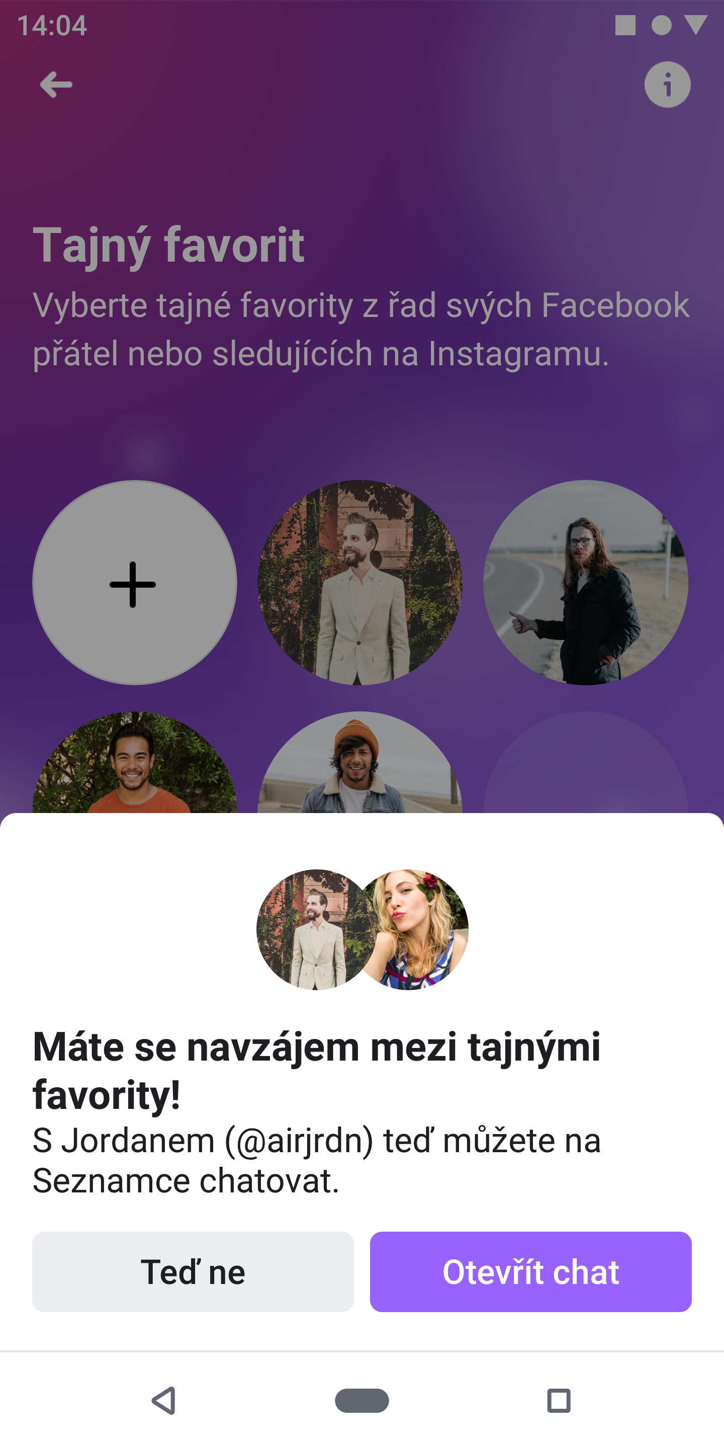 - Tajný favorit (Secret Crush): Funkce Tajný favorit vám umožní prozkoumat potenciální vztahy s lidmi, které již znáte z Facebooku nebo Instagramu. Facebook Seznamka vám nebude nabízet randění s vašimi přáteli na Facebooku, ale pokud se rozhodnete využít funkci Tajný favorit, můžete si vybrat až devět svých přátel z Facebooku nebo sledujících na Instagramu, o které máte zájem. Pokud si vás i oni do tohoto tajného seznamu přidají, je to shoda! Jestli ale osoba, o kterou máte zájem nepoužívá Facebook Seznamku, nevytvoří si seznam Tajných favoritů nebo vás na tento seznam nedá – nikdy se nedozví, že byli vaším tajným favoritem.