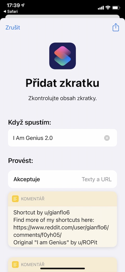 Pokud potřebujete zjistit text určité skladby – ať už z YouTube, Spotify nebo třeba Apple Music – nemusíte ho už složitě Googlit. Zkratka s názvem I Am Genius 2.0 dokáže sama rozeznat skladbu a vyhledá vám také její text s pomocí služby Genius. Nejprve se v Nastavení -> Zkratky ujistěte, že máte povolené nedůvěryhodné zkratky. Poté rozklikněte tento odkaz v Safari na iPhonu, u kterého chcete zkratku aktivovat, a v nastavení zkratky povolte její přístup ke službě Apple Music a zobrazení na listu sdílení. Poté stačí už jen v průběhu přehrávání skladby klepnout na ikonku sdílení a ze seznamu vybrat zkratku I Am Genius 2.0.