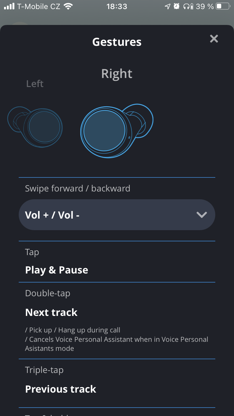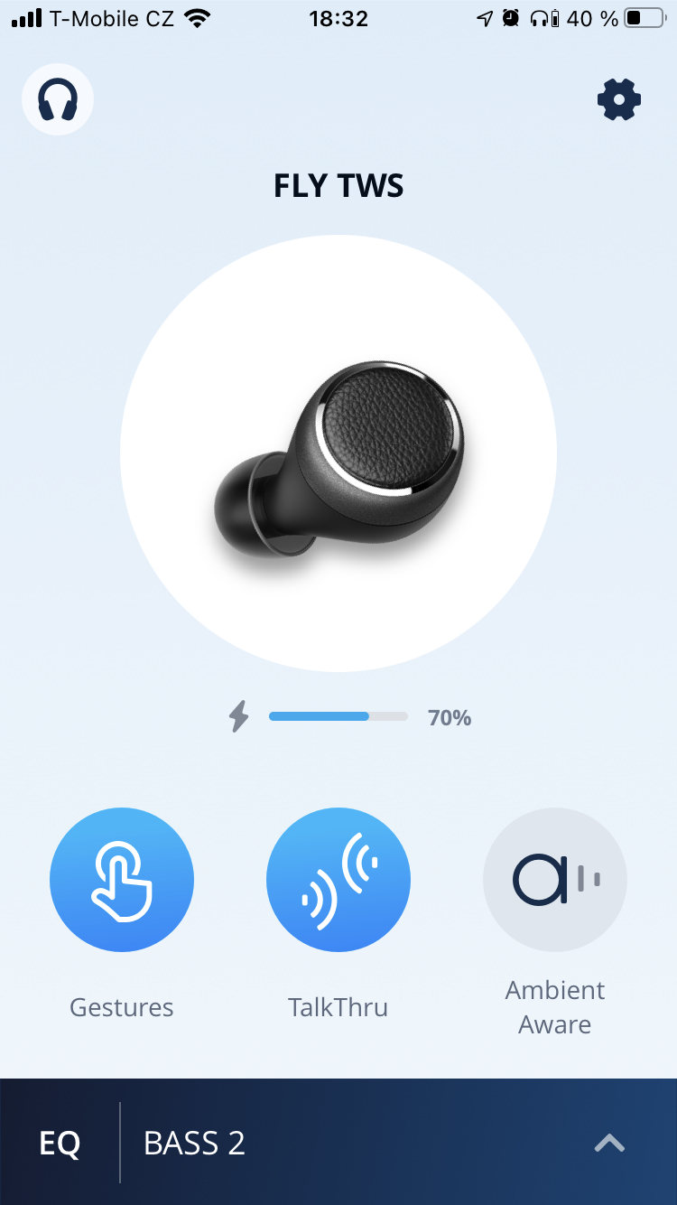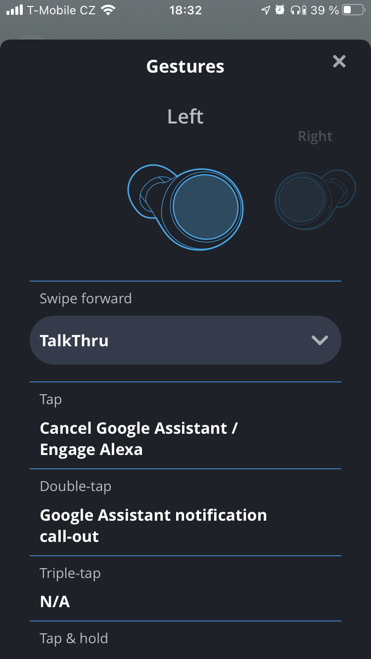 Díky ní je možné si na levé sluchátko namapovat gesto pro zapnutí funkce Talk Through nebo Ambient Aware, na pravém se pak dá nastavit upravování hlasitosti. Kromě toho se zde nabízí také ekvalizér s možností uživatelských presetů a další administrativní funkce sluchátek, jako je třeba aktualizace firmwaru, aktivace spolupráce s asistentkami a další.