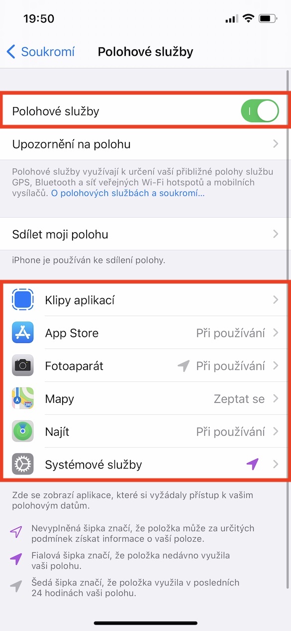 Některé aplikace, které si stáhnete, potřebují ke své činnosti přístup k vaší poloze – to je samozřejmé například u Počasí, či u navigačních aplikací. Ostatní aplikace, kupříkladu Facebook či nějaké hry, však přístup k vaší poloze nepotřebují a i přesto jej mohou mít povolený. Kromě toho, že mohou aplikace sledovat vaši polohu, tak tím mimo jiné mohou nadměrně využívat baterii. V tomto případě přejděte do Nastavení -> Soukromí -> Polohové služby, kde si otevřete určitou aplikaci a přístup k poloze u ní deaktivujte.