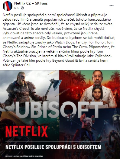 Je tomu pár dní, co jsme vás informovali o záměru Netflixu natočit seriál z prostředí velmi oblíbené herní série Assassin’s Creed. Jak ale uvedla facebooková skupina Netflix CZ + SK Fans, spolupráce bude daleko širší. Netflix chystá s Ubisoftem velké věci. Dočkat bychom se tak v příštích letech mohli filmů a seriálů na motivy hitů Watch Dogs, Prince of Persia nebo třeba Far Cry. Potenciál má tato spolupráce obrovský. Počkejme si ale, jak to dopadne.