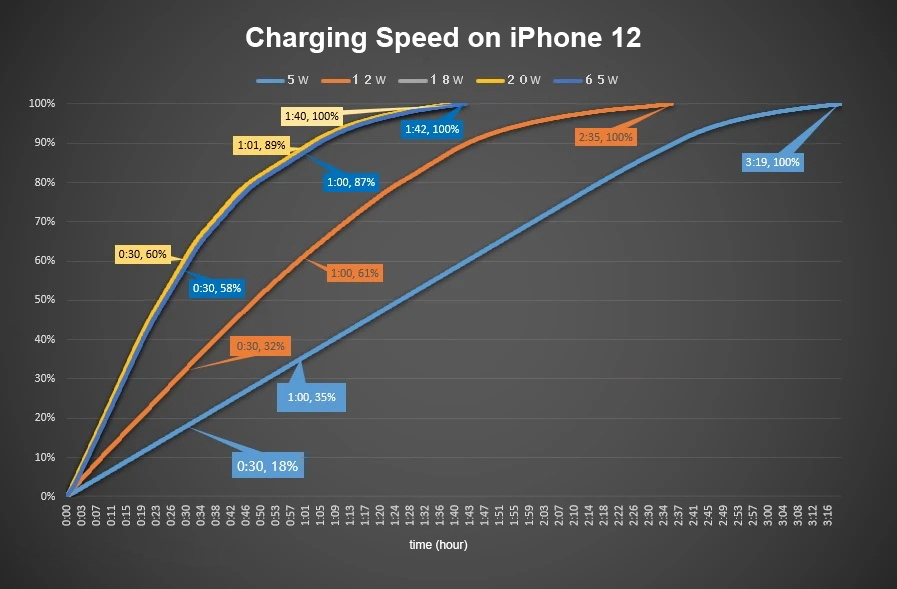 Výrobce adaptérů Aubrey se rozhodl otestovat rychlost nabíjení iPhone 12 s 5W, 12W, 18W, novou 20W a také 65W nabíječkou. A došel k tomu, že ačkoli wattáž jednotlivých Apple adaptérů pochopitelně hraje svou roli, hlavní slovo má v rychlosti nabíjení algoritmus, jenž celý napájecí okruh ovládá. Ten je totiž pro jednotlivé Apple nabíječky v praxi identický. I proto, jak ukázal test, se doba nabíjení iPhone 12 u několika adaptérů s rozdílnými výkony téměř vůbec nemění. To se týká zejména těch, jejichž výkon překračuje 12 W – z testovaných tedy jde jak o nový 20W adaptér, tak i loňskou verzi s 18 Watty a taktéž zmiňovaný 65W adaptér. Všechny tři dokázaly nabít iPhone 12 na 100 % v rámci 1 hodiny a 42 minut – nejnovější nabíječka tohoto cíle dosáhla ještě o 2 minuty rychleji, při běžném používání se však jedná o velmi marginální rozdíl. Identické výsledky byly zaznamenány i v průběhu samotného měření.