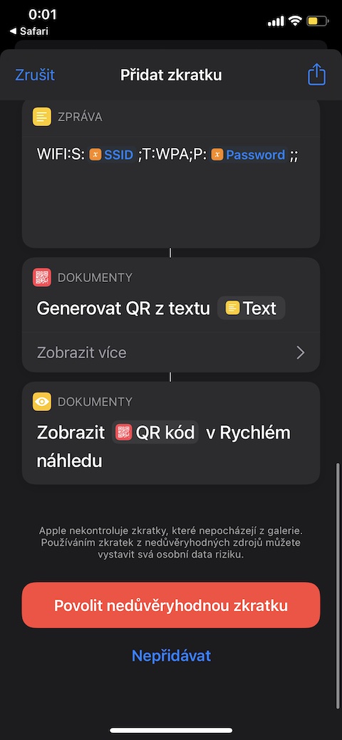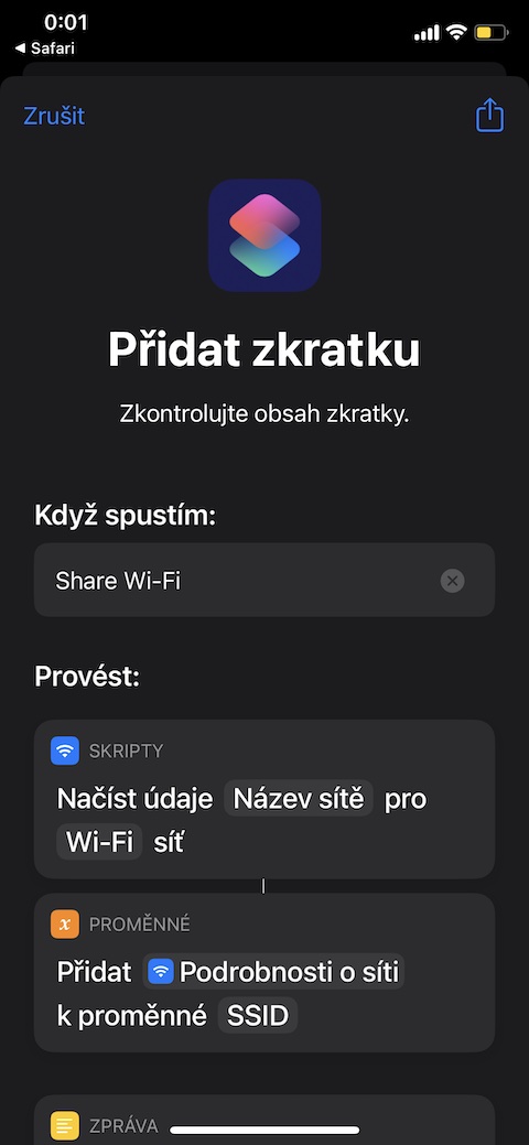 Určitě znáte situaci, kdy k vám domů přijde návštěva a poprosí vás o sdělení hesla k vaší domácí Wi-Fi. Pokud se vám nechce sdělovat heslo – což je zcela pochopitelné – můžete pro tyto účely použít zkratku Share Wi-Fi. Tato zkratka vám vygeneruje speciální QR kód, který návštěvník zkrátka jen načte na své zařízení, a může pohodlně surfovat po internetu.