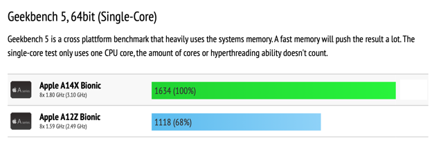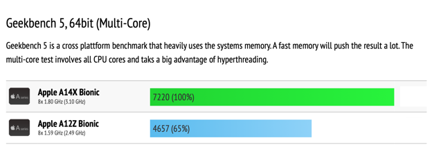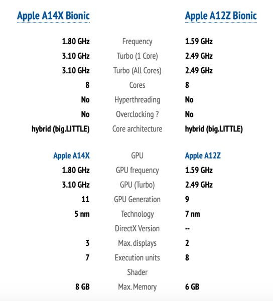 Čipset, který se v testech prováděných přes Geekbench objevil, nese označení Apple A14X Bionic a vychází z procesoru použitého v iPhonech 12 či iPadu Air 4. Jedná se tedy o 5nm čipset s osmi jádry, který si nadesignoval samotný Apple. Co se týče samotných jader procesoru, čtyři jsou u něj vysoce výkonná a čtyři pak úsporná – tedy určená primárně na jednodušší operace. Pokud by vás pak zajímal takt procesoru, ten je 1,8 GHz s Turbo Boostem 3,1 GHz. Písmeno X v názvu pak naznačuje, že se u tohoto procesoru Apple zaměřil primárně na grafický výkon, který je vyšší než u klasické verze A14. A jak si tedy z hlediska výkonu tento procesor vede? Naprosto skvěle. V testu byl porovnáván konkrétně z procesorem Apple A12Z, který tepe v iPadech Pro 2020, ale i testovacím Macu mini, který mají v současnosti k dispozici někteří vývojáři. Zatímco tento procesor získává na jedno jádro v Geekbench 5 “jen” 1118 bodů, Apple A14X Bionic získal 1634 bodů – tedy o 32 % více. Co se pak týče testu na více jader, zatímco A12Z získal 4657 bodů, A14X si připsal 7220 bodů, což je dokonce více než v Geekbench zvládá vrcholný 16” MacBook Pro. Jeho skóre na více jader je totiž “jen” 6870 bodů.