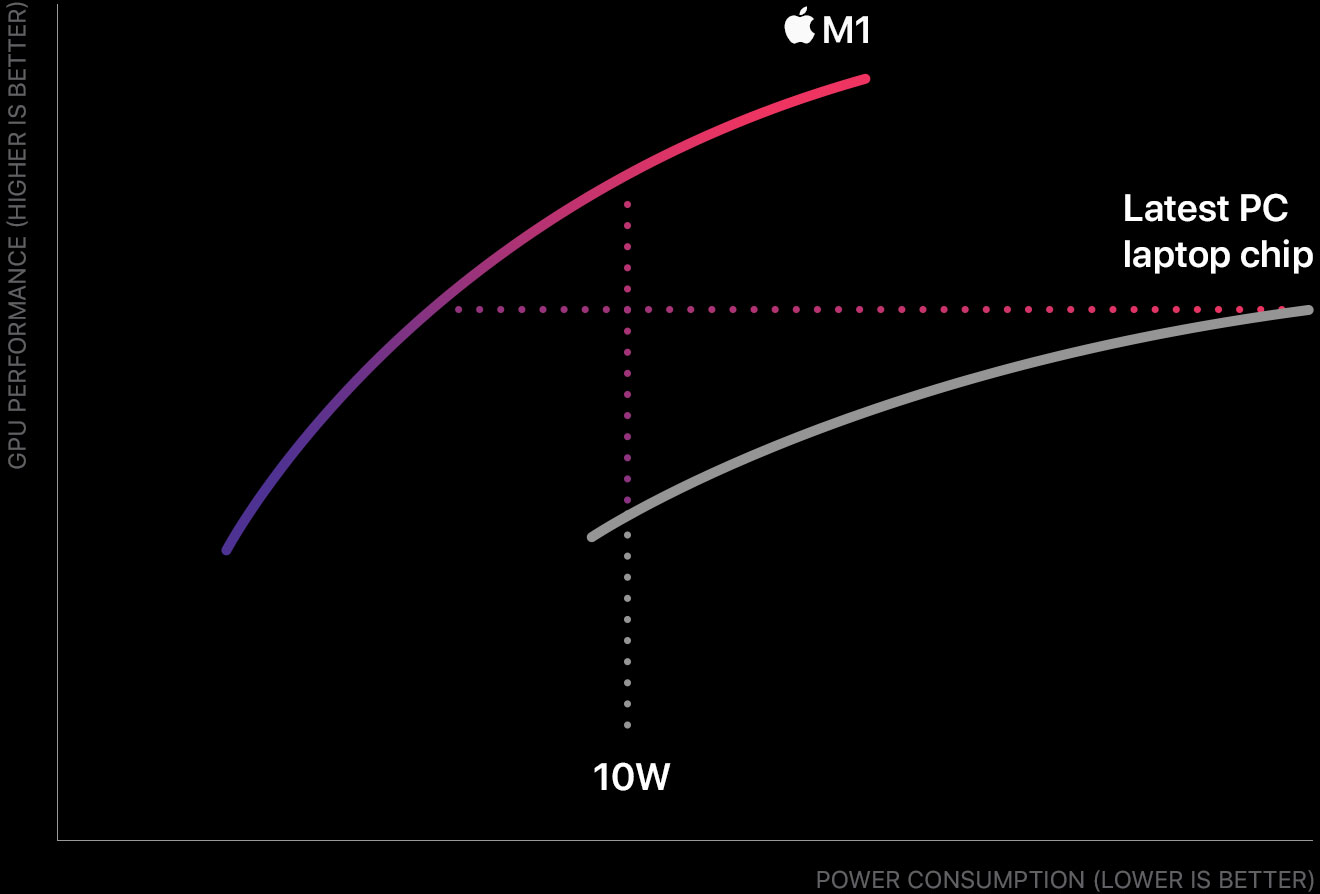 Apple navrhl procesor M1 tak, aby mohl plynule přepínat mezi vysokým výkonem a vysokou energetickou efektivností. Díky tomu dokáže procesor použít maximální množství výkonu v době, kdy to potřebujete, ale zároveň šetřit co největší množství energie v době, kdy například jen surfujete na webu nebo procházíte maily. Apple díky kombinaci funkcí Big Sur a M1 čipu dokáže nabídnout až 3x lepší energetickou efektivitu než u Intelu. Na jeden watt energie dokáže procesoru udělat až 3x více práce.