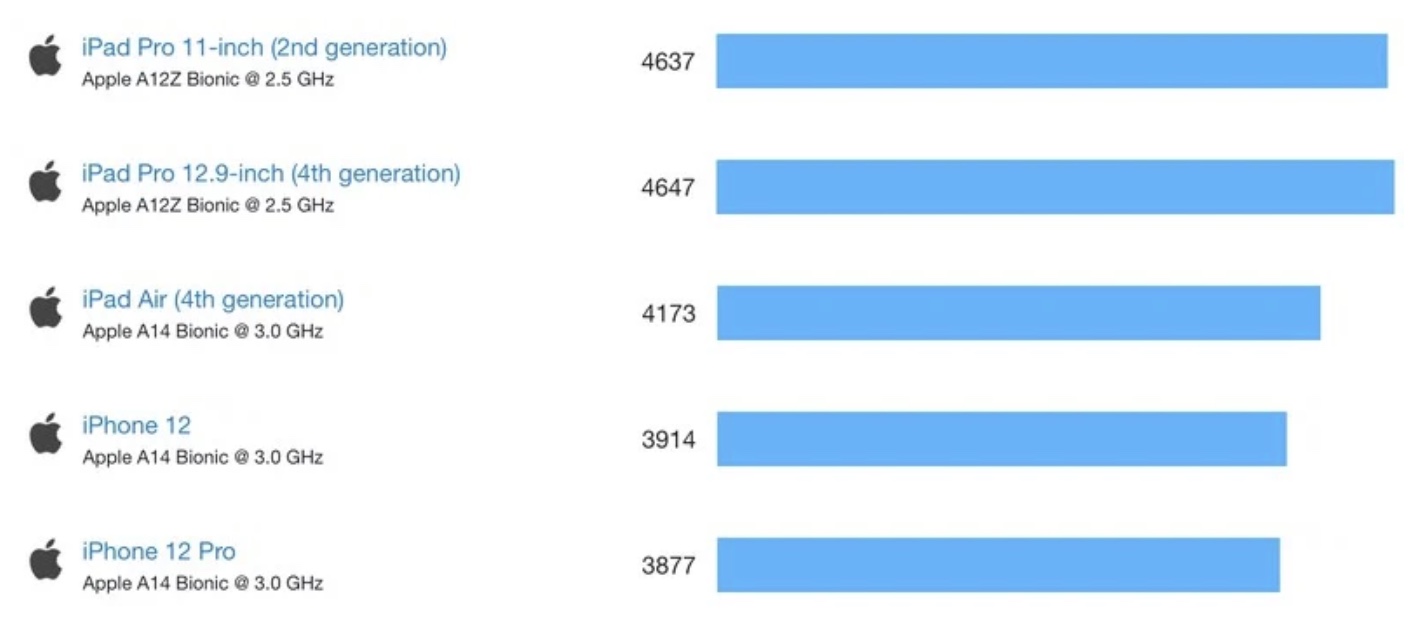 Dva výše uvedené odstavce značí, jak je na tom po výkonnostní stránce CPU. Výkonnostní test s názvem Metal z Geekbench 5 poté měří, jak je na tom po výkonnostní stránce GPU, tedy grafický akcelerátor. Vzhledem k většímu počtu grafických jader byste nejspíše čekali, že v této disciplíně zvítězí A12Z – opak je však pravdou, tedy jen částečně. Vítězem této kategorie se stal procesor A14, každopádně jen u iPadu Air čtvrté generace. Druhé místo pak obsazuje procesor A12Z u iPadu Pro, poslední paradoxně zůstal A14 u iPhonů 12. Není úplně jasné, z jakého důvodu si A14 v iPadu Air čtvrté generace vede ve výkonnostním testu GPU tak dobře, každopádně dosahuje o tři tisíce více bodů, než stejný procesor A14 u iPhonů 12. Většina z nás by čekala, že právě dvojnásobný počet GPU jader u A12Z zapříčiní absolutní výhru, každopádně tomu tak není.