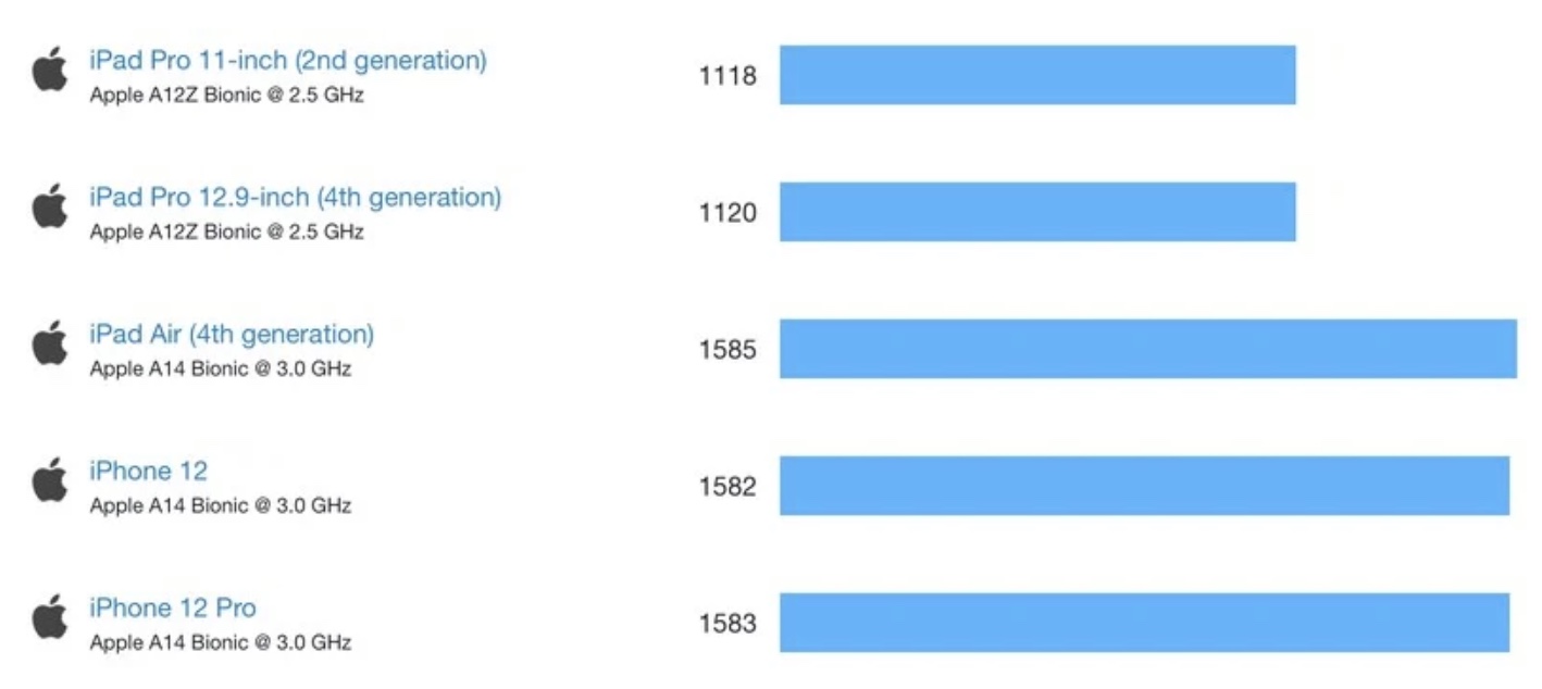 V případě, že výše uvedeným specifikacím alespoň trochu rozumíte, tak už s největší pravděpodobností tušíte, jak si oba dva procesory proti sobě vedou ve výkonnostních testech. Obecně lze výkonností testy procesoru rozdělit na single-core a multi-core, tedy výkon na jedno jádro a výkon při využití všech jader. Vzhledem ke specifikacím by tedy měl být procesor A14 ve výkonu na jedno jádro oproti A12Z lepší, naopak ve výkonu na více jader by měl být horší – a tak tomu doopravdy je. Níže naleznete výkonnostní testy z aplikace Geekbench 5.