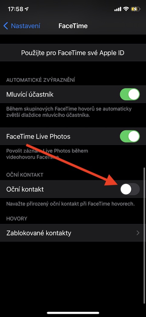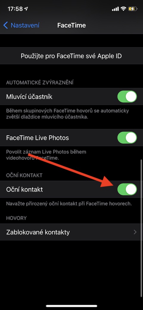 Udržet oční kontakt v průběhu videohovoru může být někdy těžké. Když se ale díváte na obrazovku nebo kamkoliv jinam, může to volanému připadat divné. V iOS 14 byla zavedena funkce, díky které bude mít volaný pocit, že se díváte přímo do přední kamery svého iPhonu, a to i tehdy, když ve skutečnosti sledujete třeba displej. Zmíněnou funkci můžete aktivovat v Nastavení -> FaceTime, kde aktivujete položku Oční kontakt.
