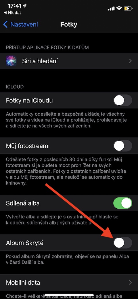 V nativních Fotkách v operačním systému iOS již delší dobu existuje možnost skrytí vybraných fotografií, ty se ale neskryjí tak docela – je možné je poměrně bez problémů najít v albu s názvem Skryté. S příchodem operačního systému iOS 14 ale uživatelé konečně získávají možnost opravdu fotografie skrýt. Ze všeho nejdříve je nutné deaktivovat album skrytých fotografií v Nastavení -> Fotky. Všechny fotografie, které od této chvíle skryjete, zůstanou na vašem zařízení i v knihovně fotografií na iCloudu, nikdo je ale neuvidí, dokud znovu neaktivujete v Nastavení album Skryté.