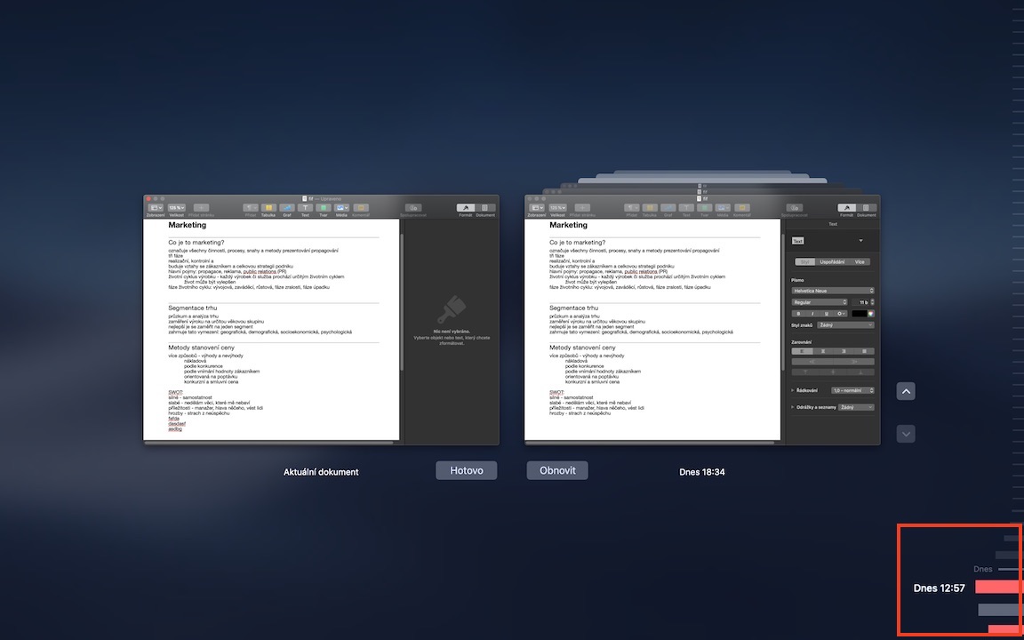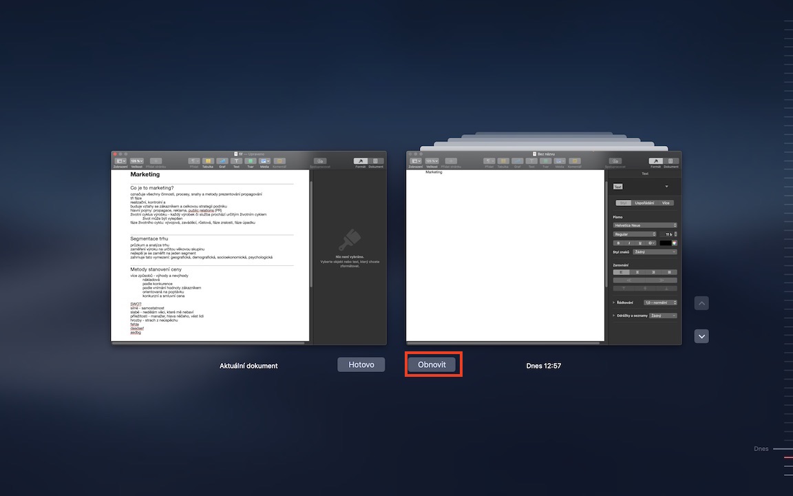 Tímto způsobem se můžete jednoduše vrátit v čase uvnitř dokumentu Pages. Jakmile klepnete na tlačítko Obnovit, tak se obnovený Pages soubor ihned zobrazí. Nezapomeňte jej samozřejmě ihned uložit, každopádně pod jiným názvem, abyste nepřišli o poslední a novější vytvořenou verzi dokumentu. Věřím, že tato možnost pro vrácení se ke starší verzi dokumentu využije mnoho z vás – čas od času se totiž ocitnete v situaci, kdy jste omylem smazali nějakou důležitou část dokumentu. Právě tato funkce vám může pomoci.