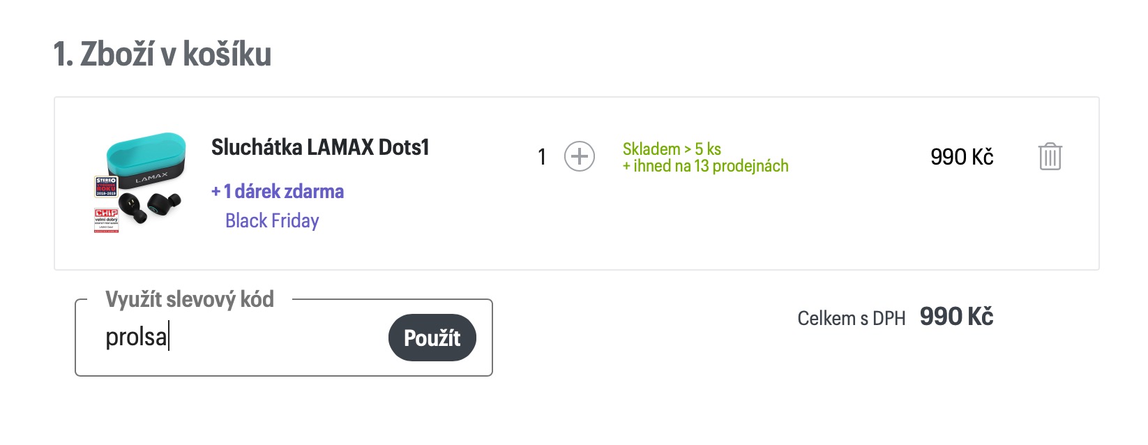 - Pod zbožím v košíku klikněte na Využít slevový kód