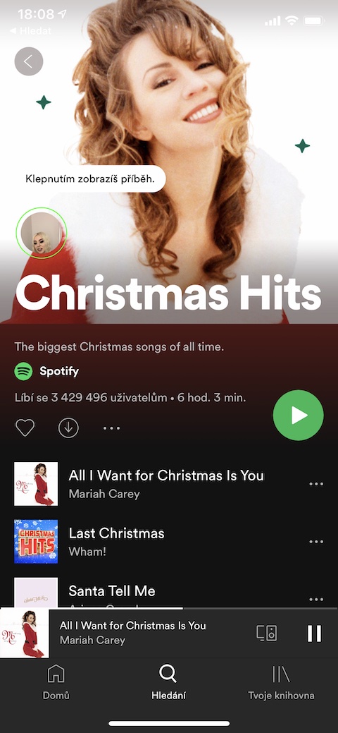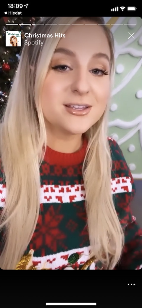 Vzhledem k povaze aplikace je pochopitelně funkce stories v aplikaci Spotify pojata přece jenom trochu jinak. V současné chvíli je možné příběhy zobrazit jen u několika málo vybraných alb a seznamů skladeb. Jako příklad si můžeme vzít třeba playlist Christmas Hits – poté, co na něj klepnete, si můžete ihned všimnout, že se od obyčejných seznamů skladeb liší – vlevo nad názvem playlistu se nachází malý kruhový výřez, ve kterém se zobrazuje náhled příběhu. Pokud klepnete na toto kolečko klepnete, můžete si prohlížet jednotlivé příběhy. Rozhraní se samotnými příběhy se vizuálně velmi podobá Instastories. V horní části displeje najdete lištu s linkami, znázorňujícími počet příspěvků. Vpravo dole se nachází ikonka tří teček, kde můžete nahlásit případný závadný obsah, a příběhy zavřete klepnutím na křížek vpravo nahoře. Mezi jednotlivými příběhy můžete přepínat klepnutím na pravou nebo levou stranu displeje. V současné chvíli se funkce příběhů nachází v prozatímní fázi testování a najdete zde příběhy od známých osobností, jako třeba Kelly Clarkson.