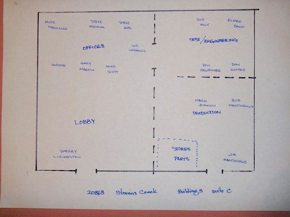 Naprosté začátky provozu společnosti Apple se odehrávaly v garáži domu Jobosvých rodičů, postupem času firma přesídlila do svých prvních kanceláří. Podmínky byly zpočátku velice jednoduché – na snímku ve fotogalerii můžete jasně vidět, že kancelář, ve které Jobs s Wozniakem tehdy působili, nebyla nikterak velká. Jednalo se v podstatě o jeden prostor, ve kterém se odehrávala jak kancelářská práce, tak i výroba. Když se počet zaměstnanců společnosti Apple rozrostl zhruba na tři desítky, přesídlila firma do svých druhých kanceláří na Bandley Drive v Cupertinu, kde už Jobs a Wozniak seděli o něco dále od sebe. Firma měla tehdy ještě do klasického korporátu hodně daleko, a svým fungováním připomínala spíše společnou práci několika přátel, zapálených pro výpočetní techniku. Za prvního manažera evropských prodejů byl tehdy považován Andre Sousan, Sue Cabannis v Applu působila jako manažerka kanceláře. O účetnictví se staral Gary Martin, hardwarovým technikem byl Don Breuner. Na spodní fotografii pak můžeme vidět Chrise Espinosu, který byl jablečným zaměstnancem číslo osm.