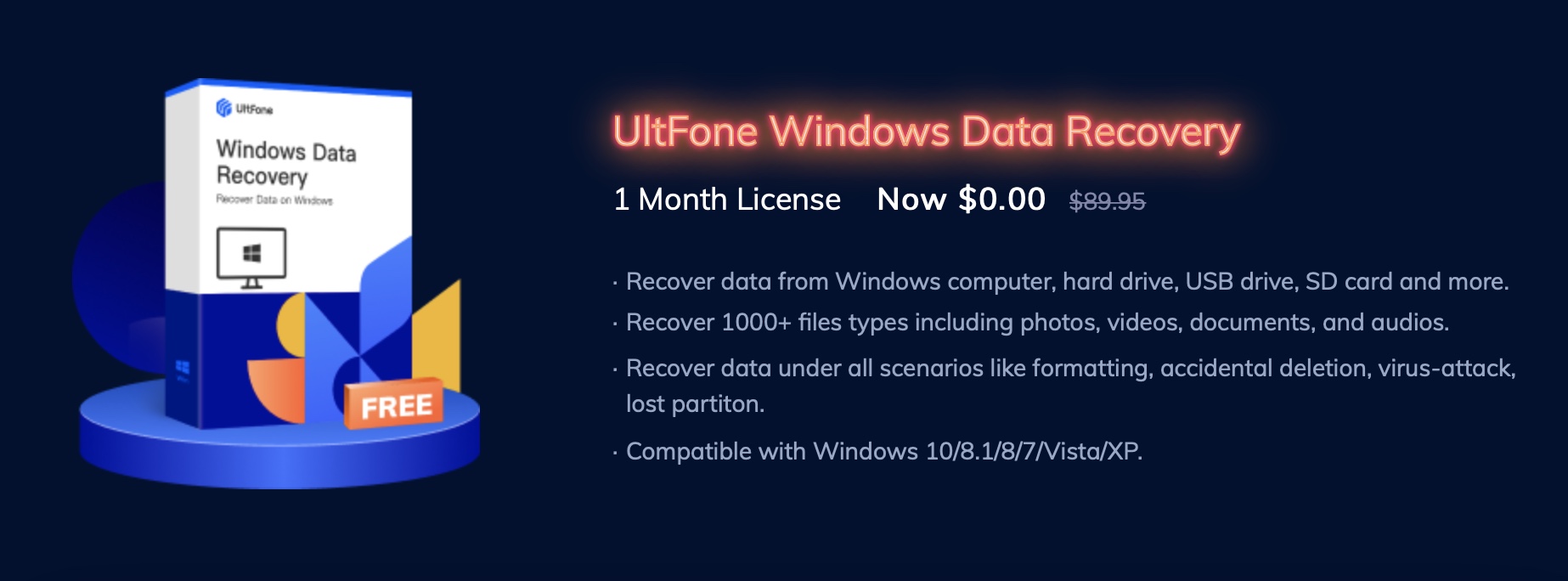 Pokud se ptáte, co je součástí hlavní Black Friday akce od Ultfone, tak se jedná o měsíční licenci zdarma pro Ultfone Windows Data Recovery. Klasicky byste za tuto měsíční licenci zaplatili 89.95 dolarů a nyní jej můžete mít zcela zdarma – stačí přejít na stránky akce. Ultfone Windows Data Recovery dokáže obnovit ztracená data z Windows počítače, tedy z pevných disků, USB disků, SD karet a dalších. Podporuje celkově více než 1000 různých typů souborů a dokáže tak obnovit fotky, videa, dokumenty či třeba hudbu. Program je pak kompatibilní s Windows XP a novějším. Chcete-li licenci zdarma získat, tak stačí, abyste akci sdíleli na Facebook, Twitter, Reddit či Pinterest.
