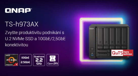 Tisková zpráva: Společnost QNAP® Systems, Inc., přední inovátor v oblasti výpočetních, síťových a úložných řešení, dnes představila QuTS hero NAS TS-h973AX se čtyřjádrovým procesorem AMD Ryzen™ V1500B 2,2 GHz řady V1000 a konektivitou 10GbE/2.5GbE. Má čtyři 2,5″ SSD sloty – přičemž dva sloty podporují jak vysoce výkonné 32Gb/s disky U.2 NVMe PCIe Gen 3 x4 SSD, tak i ekonomické SATA 6Gb/s SSD pro práci s aplikacemi vyžadujícími tu nejnižší možnou latenci. Díky operačnímu systému QuTS hero na bázi ZFS poskytuje model TS-h973AX klíčové podnikové funkce a až petabajtovou kapacitu u každé sdílené složky, a poskytuje tak vysoce výkonné, ale zároveň cenově dostupné řešení NAS.