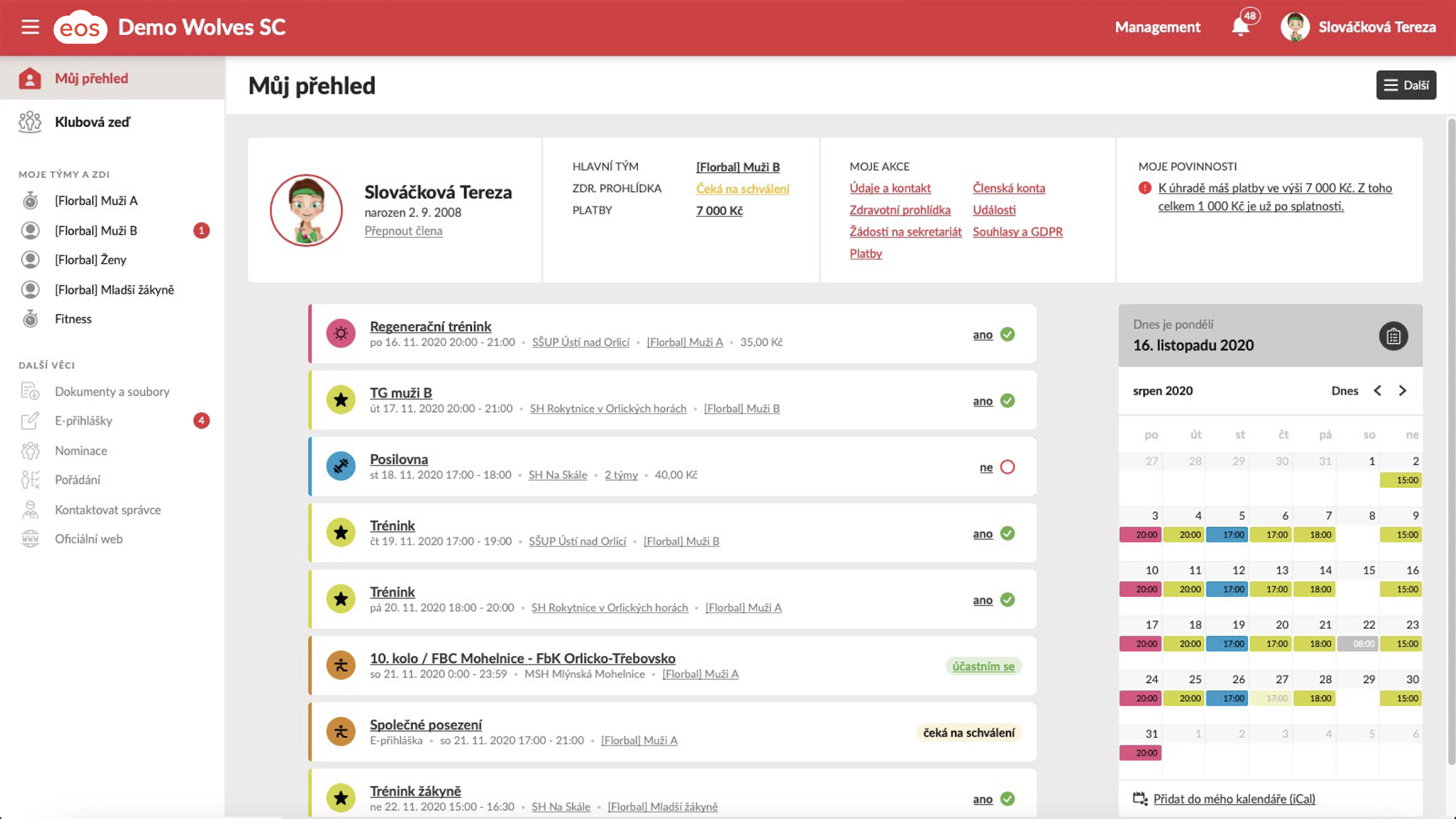 Kromě komunikace na bázi týmu pak slouží týmová zeď i k jednoduchému dohledání veškerých důležitých dokumentů ohledně daného týmu (a to jak pro realizační tým a vedení, tak i hráče), tak i k dohledání tréninkového rozpisu přímo v kalendáři, zápasů a nominací na ně. Nechybí ale ani proklik na docházku na tréninky či samozřejmě kompletní soupisku spolu s realizačním týmem, přes kterou lze jakéhokoliv člena jednoduše zkontaktovat skrze telefon nebo mail, nebo jej vyškrtnout ze soupisky či u něj zkontrolovat členské příspěvky a tak podobně. Samozřejmě pak platí, že ne každý uživatel eos club zone má přístup ke všemu – například hráčům není umožněn pohled na stav plateb a tak podobně, jelikož by jim to zkrátka bylo k ničemu. Myslím si, že právě týmové zdi a de facto týmové profily jsou asi tou nejsilnější zbraní celé platformy, jelikož dokáží poskytnout skoro až neuvěřitelně ucelený pohled na strukturu daného týmu z naprosto všech úhlů jeho fungování. Za celkové zpracování této sekce tedy musím tvůrce rozhodně pochválit.