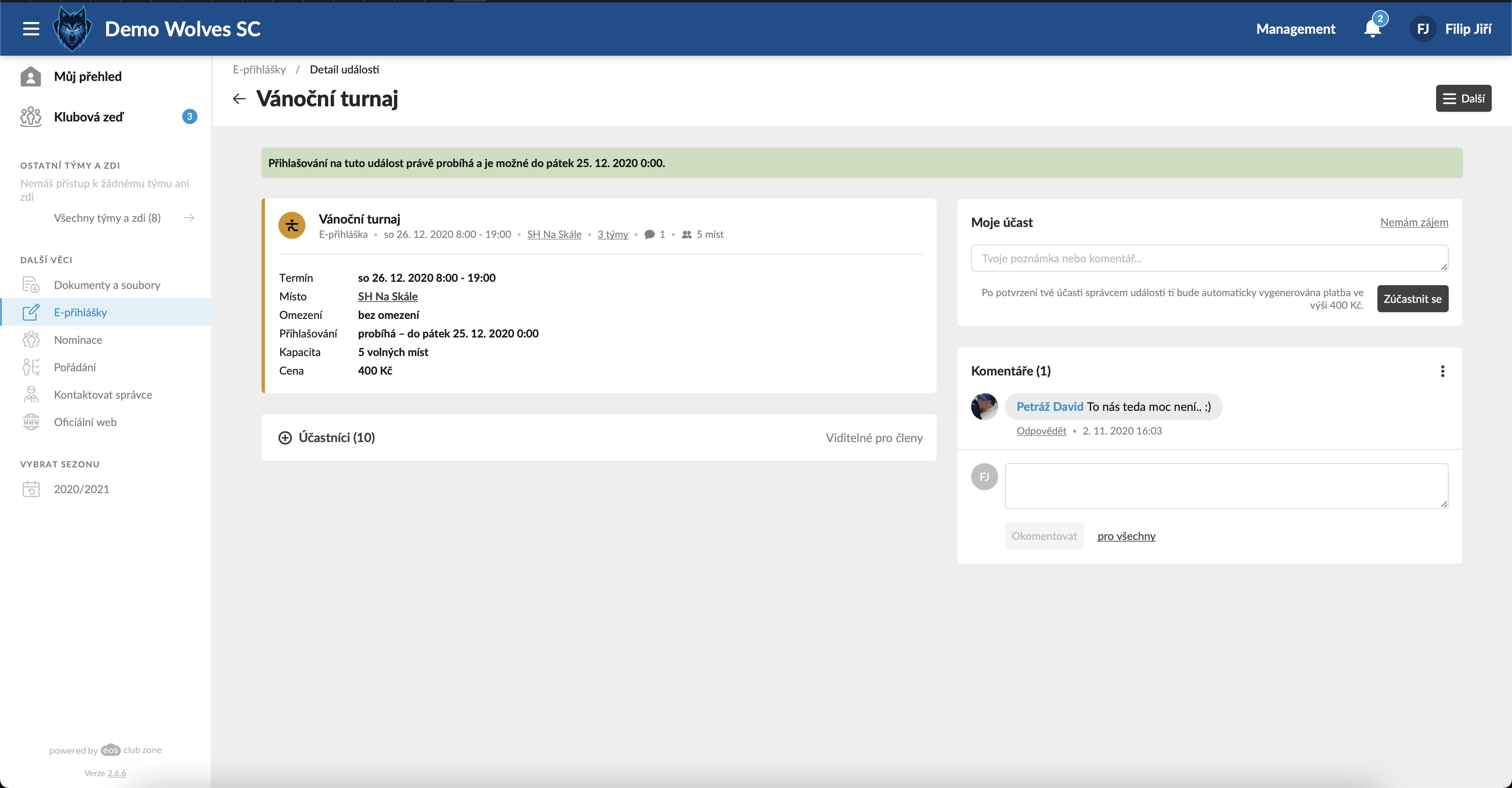 Velmi užitečnou sekcí jsou i E-přihlášky, které slouží zjednodušeně řečeno ke zjišťování zájmu o nejrůznější události “navíc” – tedy například neligové turnaje, klubová soustředění a tak podobně. Přihlášky fungují podobně jako události na Facebooku, kdy k nim lze připsat spousta doplňujících informací v čele s kapacitou či cenou a následně na ně sbíráte “Zúčastnit se”. Fajn je, že u každé miniudálosti svítí vcelku výrazně upozornění na to, že přihlášení lze ještě provést, protože zjišťování zájmu stále probíhá. Člen týmu by jej tak prošvihnout neměl – tedy není-li úplné nemehlo. Pochválit zde tvůrce musím i za to, jak si poradili s platebním systémem – respektive jeho přehledností. Platba spojená s e-přihláškou se potvrzeným účastníkům automaticky vygeneruje a dostanou notifikaci, což je nanejvýš příjemná featurka. I zde se dá opět hovořit o skvělém zjednodušení práce pro vedení klubu, jelikož organizace doprovodných aktivit není vůbec jednoduchou záležitostí – ba právě naopak. Z vlastní zkušenosti mohu říci, že právě organizace neligových “letních” turnájků ve florbale, kterých jsme se velmi rádi v minulosti s kamarády účastnili, bylo daleko větší peklo než projít celou oficiální sezónou. Spojit se totiž s více lidmi, domluvit se na účasti, ceně, ubytování a všem podobném a to ideálně v nějakém rozumném časovém horizontu se totiž opravdu moc nedařilo a upřímně věřím tomu, že to tak má 99 % menších klubů, kde se hraje takříkajíc za párek a pivo. Pro větší kluby se pak samozřejmě jedná “jen” o další skvělé zpřehlednění jinak dobře fungující struktury.