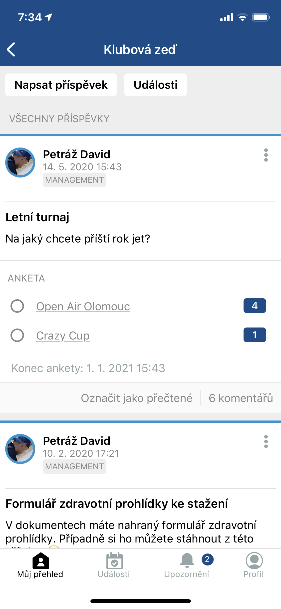 Názvy jednotlivých sekcí mluví samy za sebe. Například Klubová zeď funguje, jak asi očekáváte, víceméně stejně jako zeď na Facebooku, takže jí můžete de facto využít jako veřejnou nástěnku pro připnutí informací, které by měli členové vašeho klubu vědět. Kromě této možnosti zdi je pak samozřejmě k dispozici i zeď týmová, která slouží ke komunikaci jen na úrovni daného týmu, což je rozhodně fajn, jelikož to výrazně napomáhá v přehlednosti celé platformy. Přeci jen, elitní tým mužů by asi moc nezajímalo, že se trénink elévků přesouvá výjimečně z úterka na středu. Velmi užitečnou vychytávkou je pak dle mého notifikační systém na všechny nové příspěvky a odpovědi v nich, který využívá jak mail, tak notifikace v aplikaci na smartphonech. Není tedy prakticky možné, aby vám cokoliv zásadního uniklo.