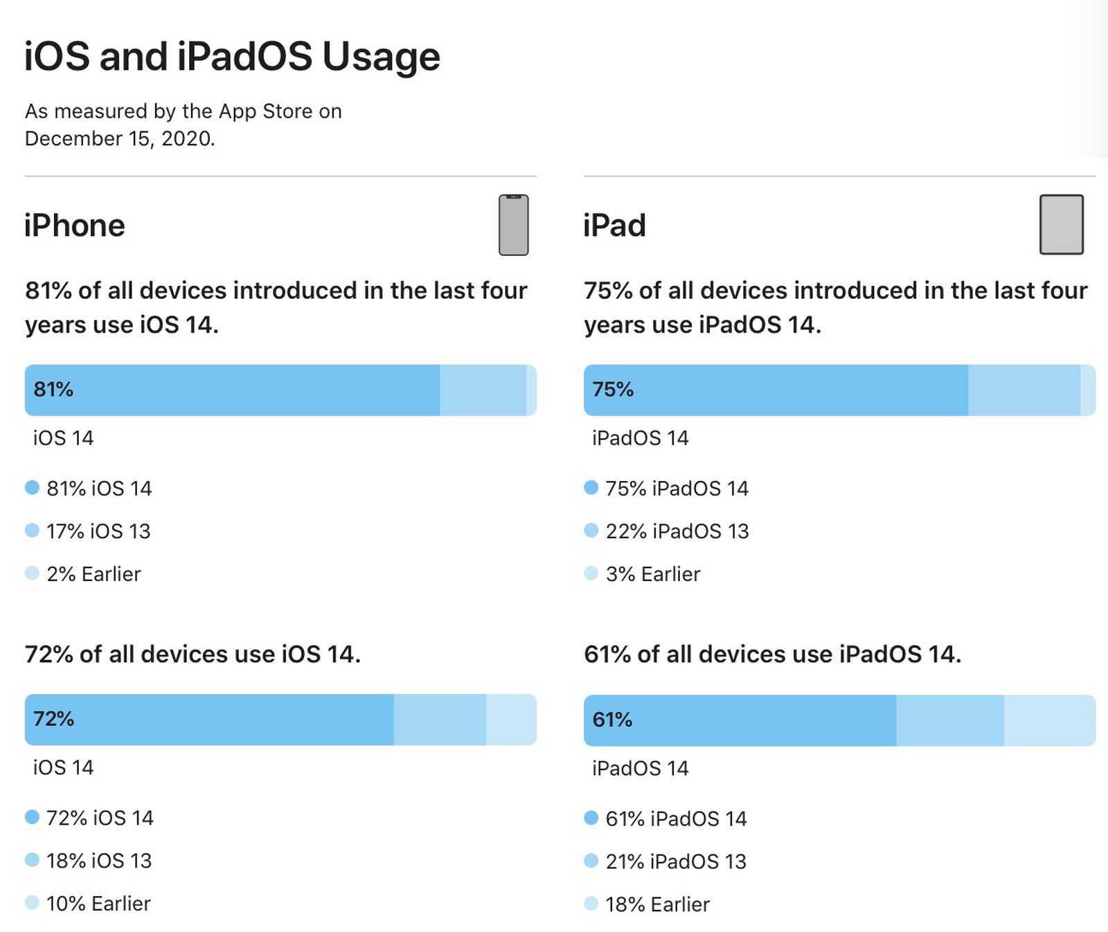 V posledních měsících se Apple rozhodl data o instalaci jeho systémů poskytovat jako z hlediska všech zařízení, tak i z hlediska zařízení vydaných v posledních čtyřech letech. V obou těchto aspektech si dle očekávání vede iOS 14 velmi dobře. Podle dat Applu totiž běží na 72 % všech aktivních iPhonů ve světě, mezi které se samozřejmě počítají i modely již nekompatibilní. 18 % ze zbylých zařízení pak běží na iOS 13 a zbytek na dřívějších verzích, což je pořád relativně velké množství. Co se pak týče iPhonů z posledních čtyř let, iOS 14 využívá 81 % z nich. Zbylých 17 % pak patří iOS 13 a 2 % starším verzím. I zde si tedy vede Apple velmi dobře-