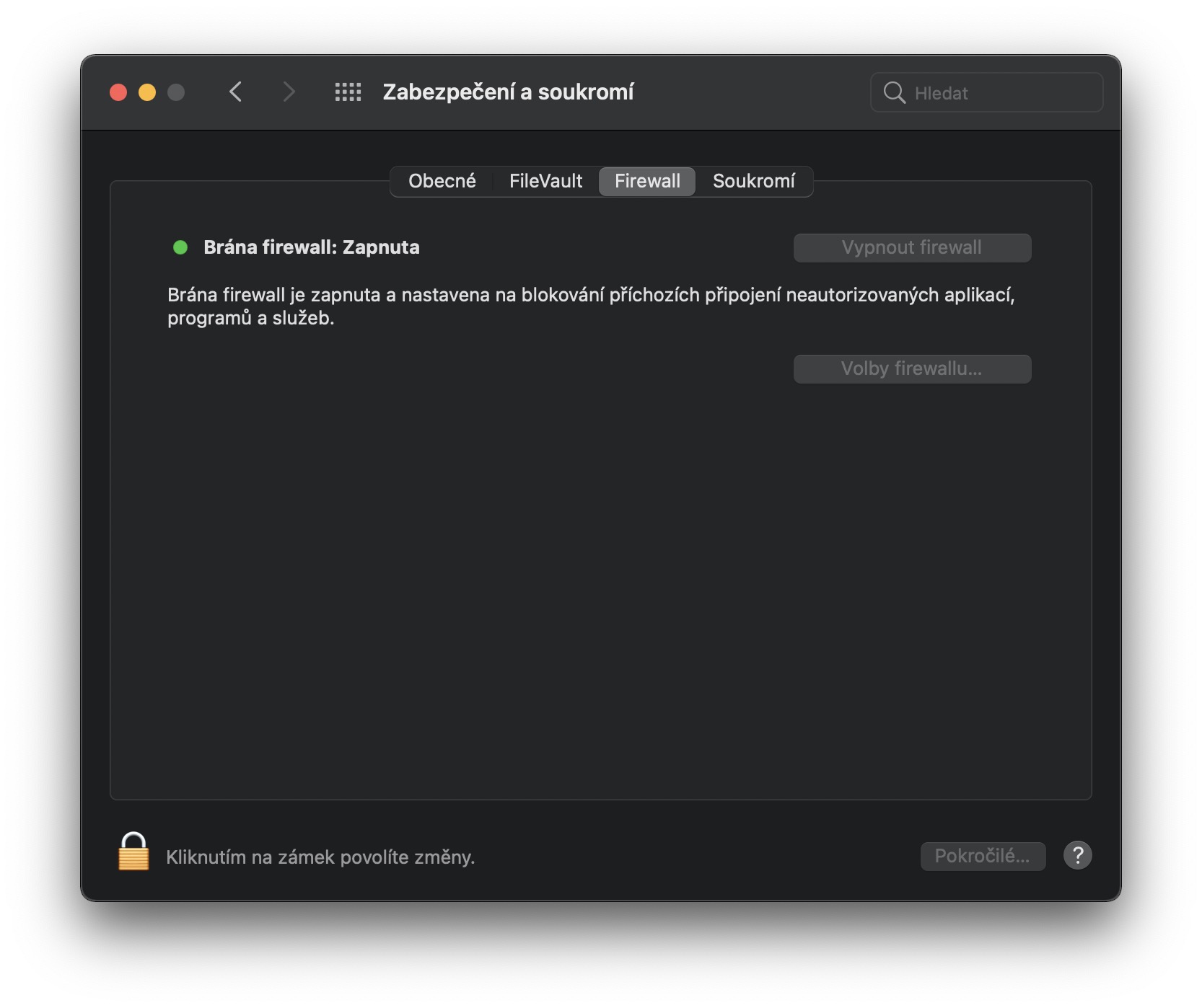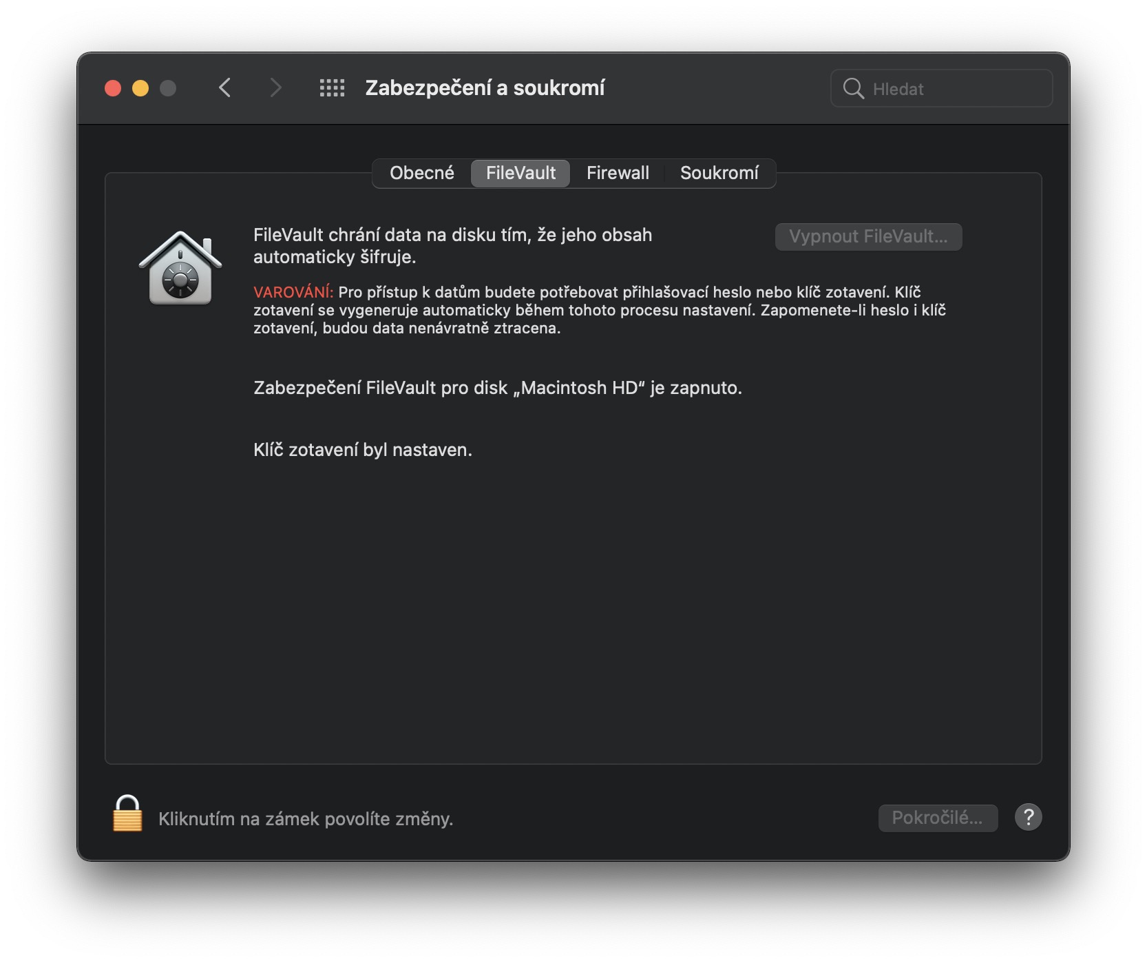 Pokud byste navíc chtěli ochránit svá data a mít je tak v zašifrované podobě, ve stejném panelu stačí nahoře zvolit možnost FileVault a stejnojmennou vychytávku aktivovat. Dávejte si ale pozor na heslo. Jakmile jej totiž zapomenete, tak se k vašim datům už nikdy nikdo nedostane. Nadále si určitě ještě zkontrolujte, zdali máte aktivní Firewall.