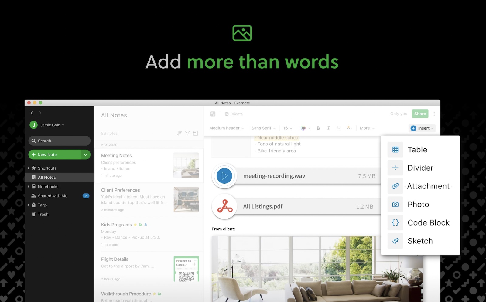 Operační systémy iOS a macOS nabízí poměrně slušné nativní aplikace, které jsou v mnoha případech dostačující. Pro příklad si můžeme uvést program Poznámky, jehož název perfektně vystihuje samotný účel. Z vlastních zkušeností ale raději sahám po alternativním řešení v podobě programu Evernote. Dalo by se říci, že se jedná o takové „Poznámky na steroidech,“ což samozřejmě dokazuje řada dalších možností, které tento nástroj nabízí. Jednotlivé dokumenty si totiž můžete rozdělit do samostatných zápisníků, jenž můžeme přirovnat například k sešitům. Díky tomu získáte nad vším podstatně lepší přehled. K samotným poznámkám si navíc můžete přidat i upomínky. Vše je samozřejmě automaticky synchronizováno, a proto vám stačí se přihlásit, díky čemuž k vašim dokumentům můžete přistupovat z Macu, iPhonu a iPadu. K dispozici byla i verze pro jablečné hodinky, která ale při poslední velké aktualizaci zmizela. Každopádně dočkat bychom se měli již brzy.