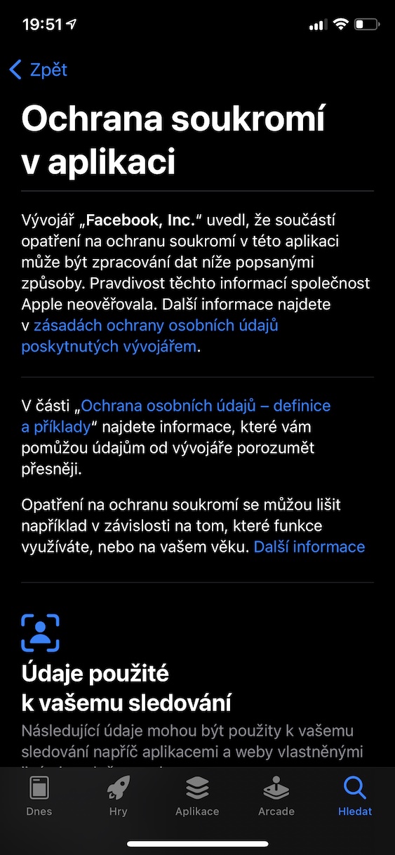 Kalifornský gigant patří mezi jednoho z mála technologických gigantů, kterým na bezpečí a ochraně soukromí jeho zákazníků záleží. Existuje mnoho jedinců, že si Apple na takovou společnost pouze hraje, což ale není tak úplně pravda. Stačí se podívat například na poslední krok Googlu, který již po dobu téměř měsíce v App Storu neaktualizoval své aplikace, aby nově nemusel zobrazovat, k jakým datům mají přístup. Od prosince minulého roku musí totiž všichni vývojáři při aktualizaci či přidání nové aplikace přesně určit, k jakým datům a službám má přístup. Uživatelům se pak tyto informace zobrazí přehledně v jakýchsi kartičkách. Chcete-li informace o ochraně soukromí zobrazit, tak v App Storu vyhledejte konkrétní aplikaci. Poté na ni klepněte, čímž se otevře její profil, a sjeďte o kus níže pod hodnocení k Ochrana soukromí v aplikaci, kde klepněte na Zobrazit podrobnosti.