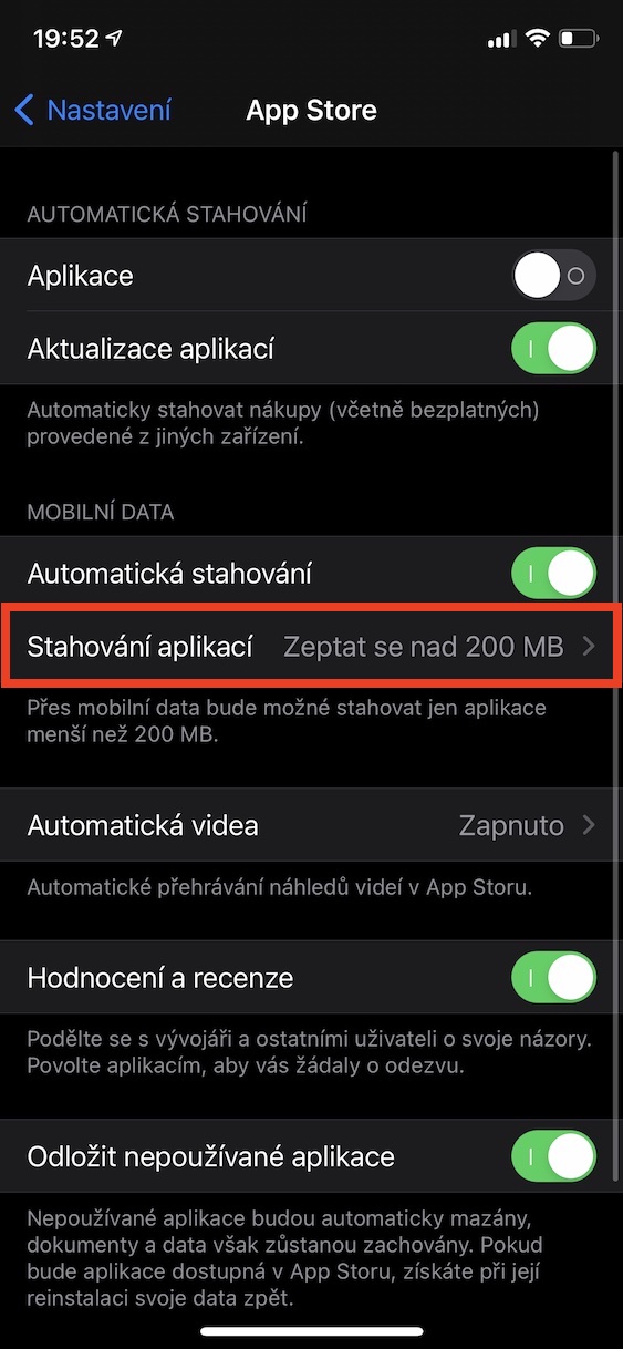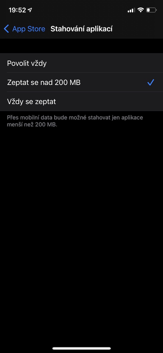 Pokud jste si ve starších verzích iOS chtěli prostřednictvím mobilních dat stáhnout aplikaci, která měla přes 200 MB, tak jste nemohli. Apple tohle omezení zavedl kvůli tomu, aby si uživatelé omylem nevyplýtvali svá mobilní data. Doba jde každopádně neustále kupředu a tarify s mobilními daty jsou objemnější a levnější. Díky tomu existuje mnoho jedinců, kteří celý měsíc fungují jen na mobilních datech a nepoužívají vůbec Wi-Fi. Nedávno jsme se však naštěstí dočkali přidání možnosti volby, kdy si můžeme zvolit, zdali bude stahování velkých aplikací z App Storu na mobilních datech možné. Stačí, abyste přešli do Nastavení -> App Store, kde v kategorii Mobilní data klepněte na Stahování aplikací. Zde už si jen stačí vybrat příslušnou možnost.
