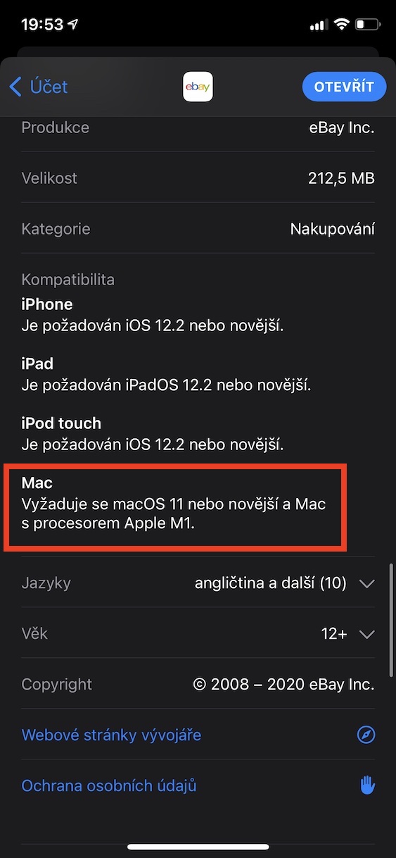 Minulý rok v listopadu Apple představil svůj vůbec první vlastní čip z rodiny Apple Silicon, který nese název M1. Tento čip se nyní nachází v MacBooku Air, 13″ MacBooku Pro a Macu mini. Vzhledem k tomu, že procesory Apple Silicon z nejnovějších Maců běží na stejné architektuře jako mobilní procesory A-series, tak na nich můžete relativně jednoduše spouštět iOS a iPadOS aplikace. Pokud chcete zjistit, zdali budete schopni vybranou iOS či iPadOS aplikaci schopni spustit na Macu s M1, tak se nejedná o nic složitého. Prvně otevřete App Store, kde poté vyhledejte konkrétní aplikaci a otevřete její profil. Poté na něm sjeďte o kus níže k sekci Kompatibilita, kterou rozklikněte. Pokud se zde objeví řádek Mac – Vyžaduje se macOS 11 nebo novější a Mac s procesorem Apple M1, tak ji můžete na Macu s M1 spustit.