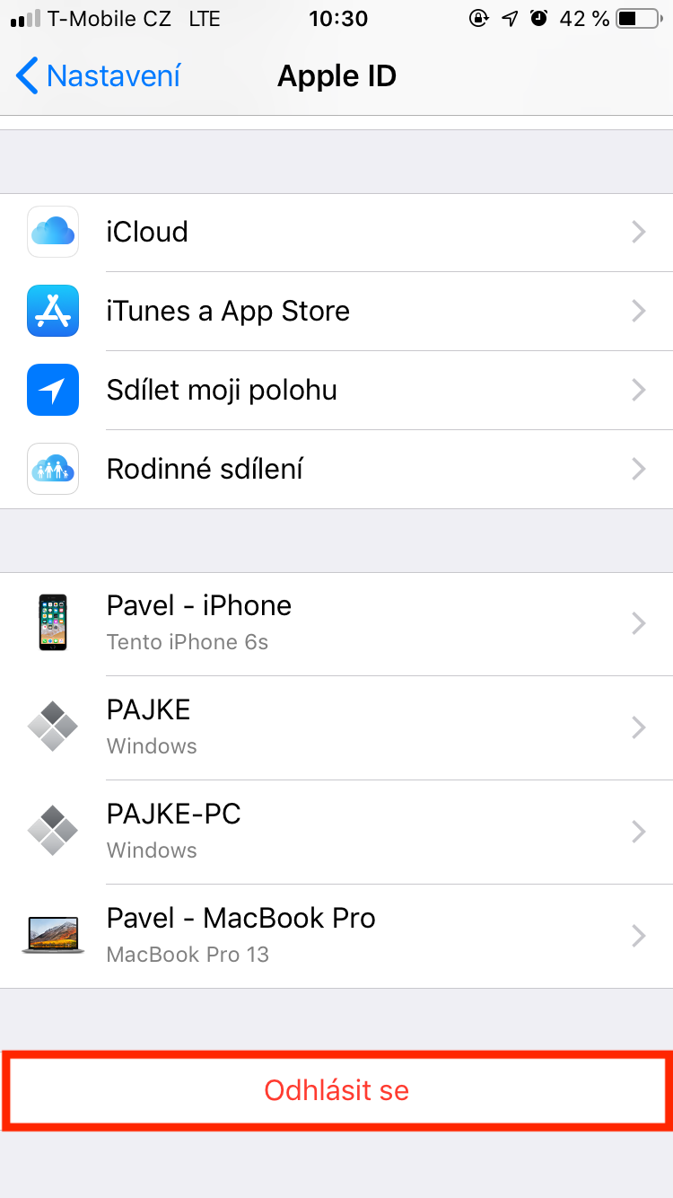 Odhlášení z Apple ID a obnova do továrního nastavení