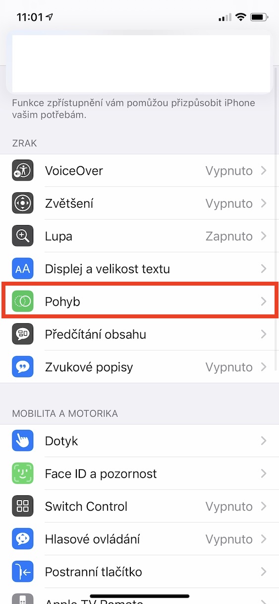 - V sekci Zpřístupnění nyní sjeďte opět níže a lokalizuje kolonku Pohyb, kterou otevřete.