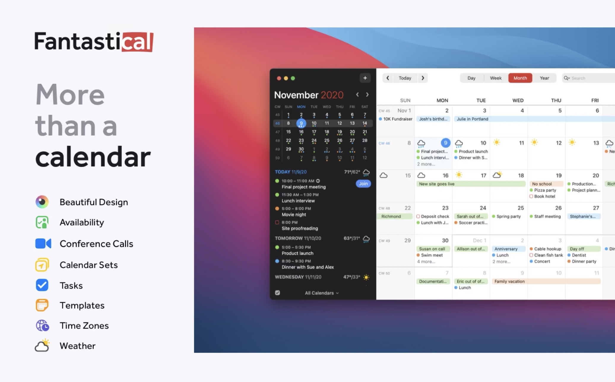Aplikace Fantastical patří mezi jednu z nejpopulárnějších kalendářových aplikací, které můžete v App Storu stáhnout. Využívat ji můžete napříč všemi jablečnými zařízeními. Dobrou zprávou je, že ve Fantastical najdete prakticky vše, co můžete od kalendářové aplikace očekávat, dokonce si do něj můžete také kalendáře importovat z jiných služeb. Nechybí možnost pro přidání různých připomínek a poznámek. Na Macu můžete Fantastical ovládat také z horní lišty.