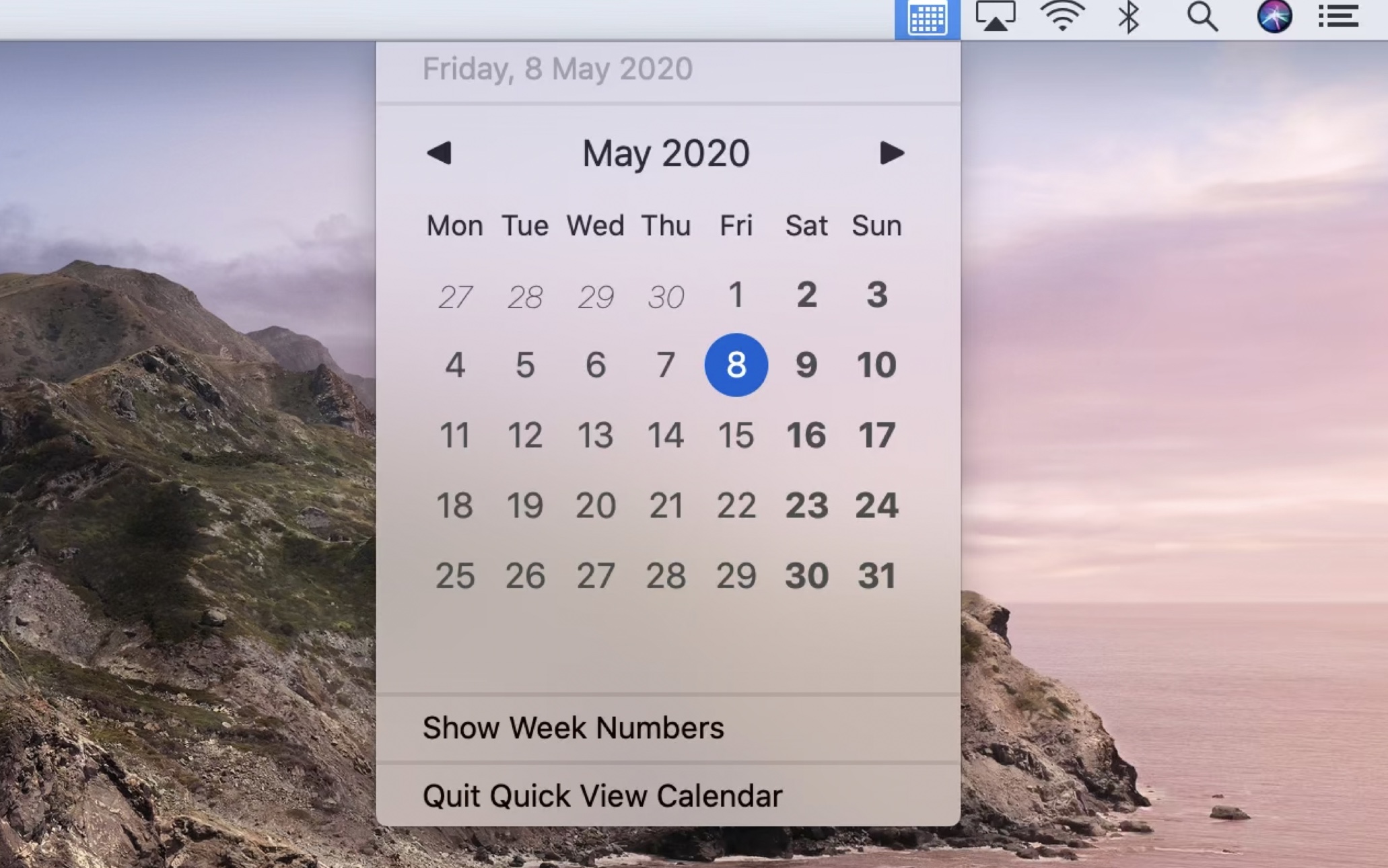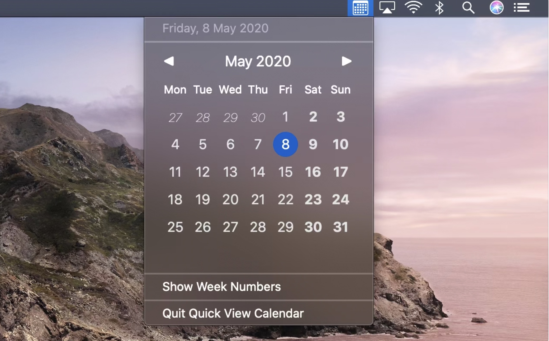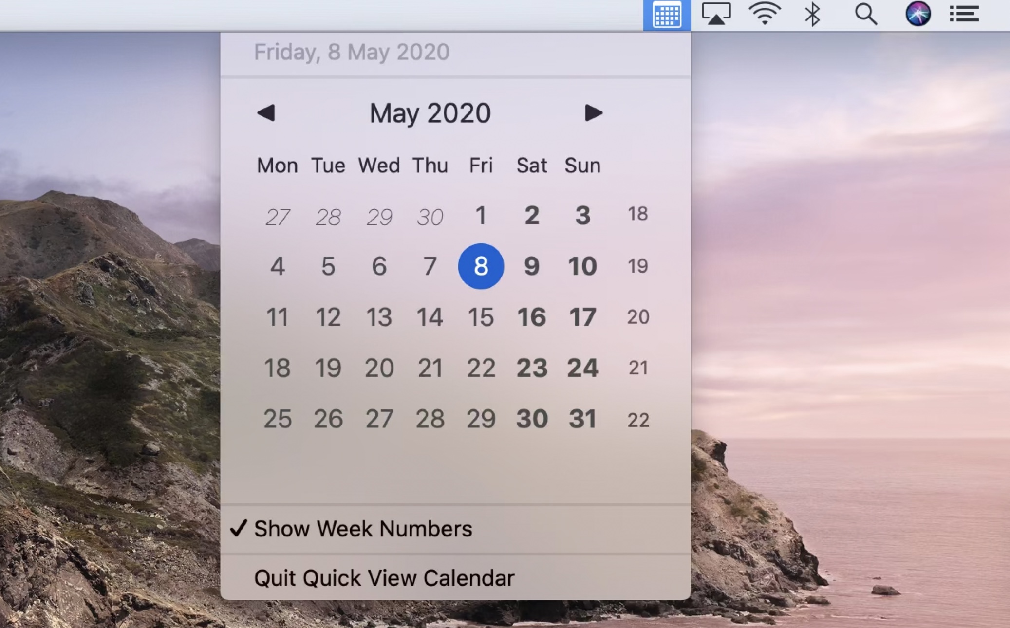 Výše jsme zmínili aplikaci Fantastical, která patří mezi jednu z nejoblíbenějších aplikací pro správu kalendářů. Pokud však hledáte opravdu jednoduchý kalendář, který vám zobrazí pouze data, tak můžete sáhnout po Quick View Calendar. Díky této aplikaci se vám v horní liště zobrazí ikona a když ji rozkliknete, tak se můžete jednoduše přesouvat mezi jednotlivými měsíci v roce a sledovat týdny.