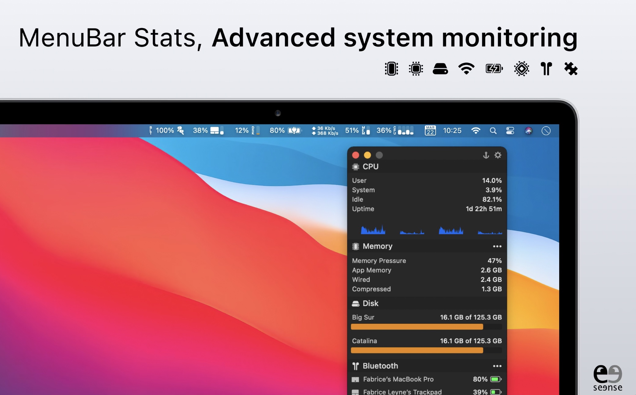 Jestliže hledáte komplexní aplikaci, pomocí které můžete sledovat prakticky všechno co vás napadne – od počasí až po úroveň nabití vašeho Magic Trackpadu – tak sáhněte po iStatMenus. Osobně tuto aplikaci pro sledování naprosto všeho využívám již několik měsíců a asi si už neumím představit, že bych bez ní fungoval. Sleduji s ní vytížení a teploty hardwaru, otáčky ventilátoru a baterii AirPods, Magic Keyboard a Magic Mouse.