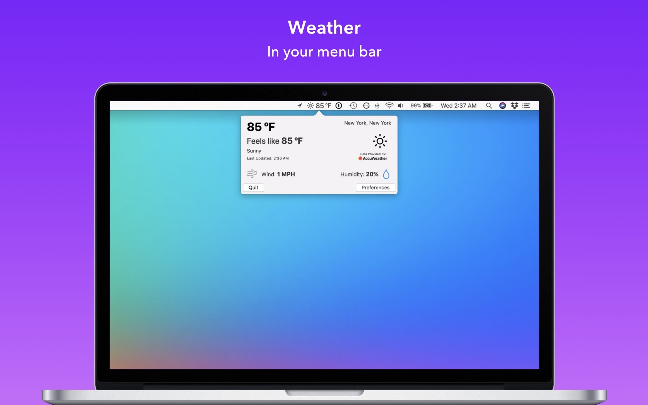 Pokud vám z nějakého důvodu nevyhovuje počasí, které si můžete zobrazit prostřednictvím widgetu, tak můžete sáhnout po MenuWeather+. Tato aplikace vám totiž dokáže zobrazit informace o počasí v horní liště. Konkrétně tato aplikace dokáže zobrazit teplotu, povětrnostní podmínky, vlhkost a mnoho dalšího.