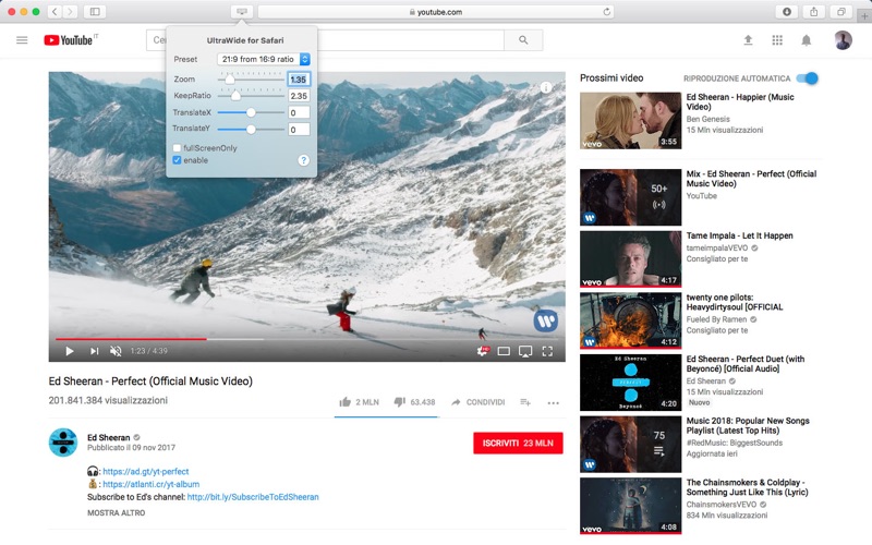 Aplikace UltraWide for Safari primárně cílí na majitele ultraširokoúhlých monitorů, které se pyšní poměrem stran například 21:9. Tento nástroj vám totiž umožní videa z YouTube převést do požadovaného poměru stran, díky čemuž dokážete využít maximální potenciál vašeho monitoru bez černých postranních pruhů.