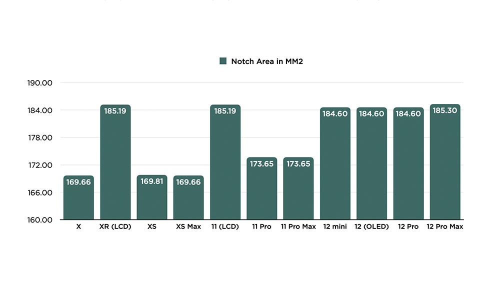 Nejvíce vypovídající hodnotu nabídne bezesporu celková plocha nebo chcete-li obsah výřezů jednotlivých modelů. U iPhonu X a XS Max zabíral podle měření 512pixels výřez plochu 169,66 mm², u iPhonu XS to bylo 169,81 mm², následují iPhony 11 Pro a 11 Pro Max se 173,65 mm² a až po nich přichází na řadu OLED iPhony 12. Výřezy modelů 12 mini, 12 a 12 Pro mají totiž plochu 184,60 mm², což je jen nepatrně méně než plocha výřezu iPhonů XR a 11. Ta totiž má 185,19 mm². iPhonem s doposud největším výřezem v displeji je pak model 12 Pro Max, u kterého naměřili 512pixels plochu 185,30 mm². Je tedy zcela evidentní, že se zmenšování výřezů v loňském roce nekonalo – tedy minimálně oproti prémiové řadě iPhonů.