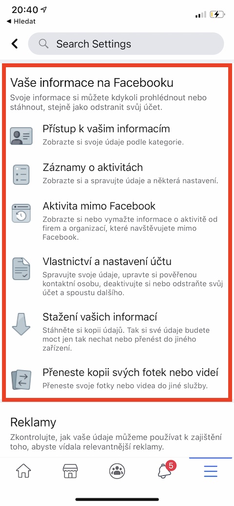 Osobní údaje na Facebooku budou nově rozděleny hned do několika samostatných kategorií – vaše aktivita na Facebooku, přátelé a sledující, předvolby, osobní informace, informace o reklamě, aplikace a webové stránky mimo Facebook, informace o zabezpečení a přihlašování a další. Součástí tohoto nového nástroje je také funkce vyhledávání nebo třeba informace o tom, jakým způsobem mohou být vaše údaje využiti k tomu, aby došlo ke zlepšení vašeho používání této sociální sítě. Nově přepracovaný nástroj byl podle vyjádření zástupců Facebooku vyvinut ve spolupráci s uživateli a na základě jejich zpětné vazby ohledně používání předchozí verze. Pokud si i vy chcete vyzkoušet tento nový nástroj, spusťte na svém iPhonu aplikaci Facebook a v pravém dolním rohu klepněte na ikonku tří linek. Zajeďte až dolů, klepněte na Nastavení a soukromí -> Nastavení -> Vaše informace na Facebooku.