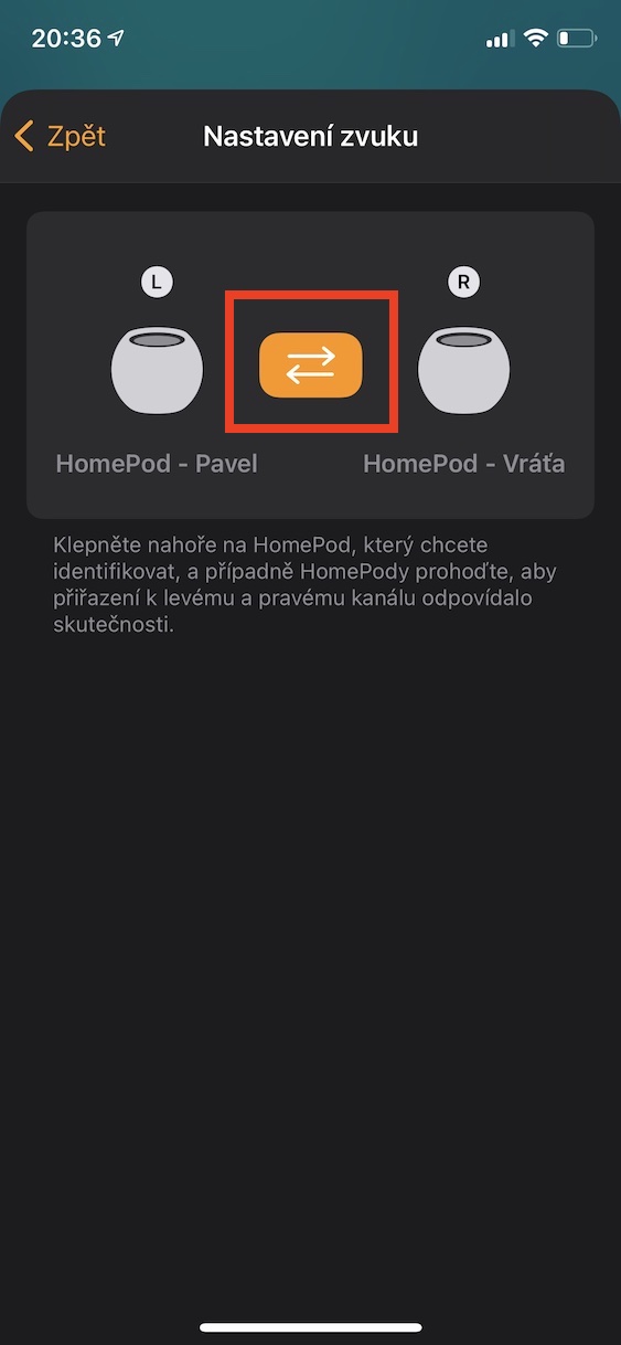 - Pro přehození kanálů už nyní jen stačí, abyste klepnuli na šipky mezi dvěma HomePody.