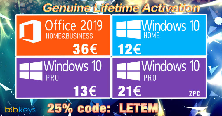 - Doživotní klíče na Windows 10 Pro 2 PCs: 20,7 € /545 Kč(10.35€/272 Kč pro 1 PC)