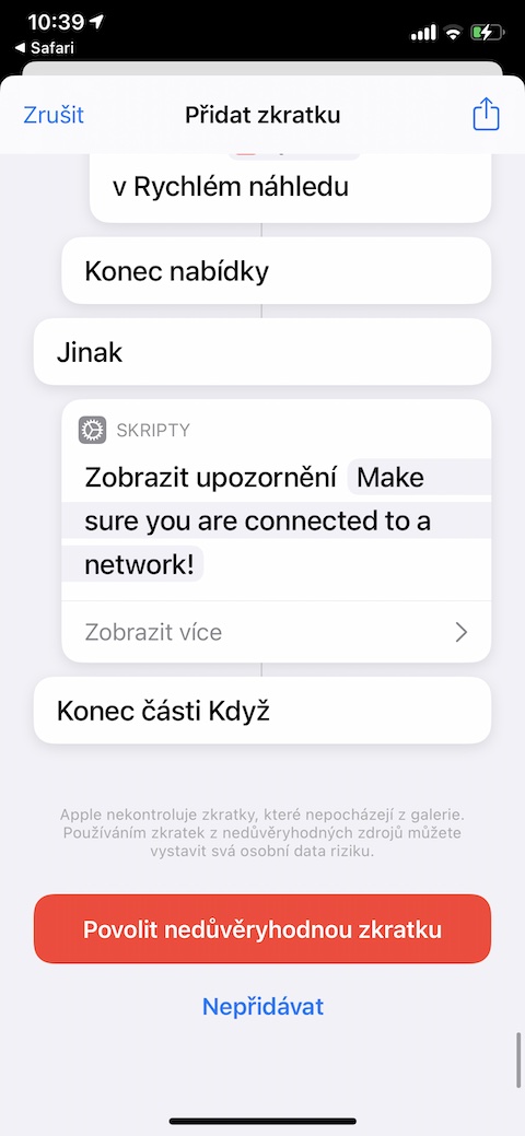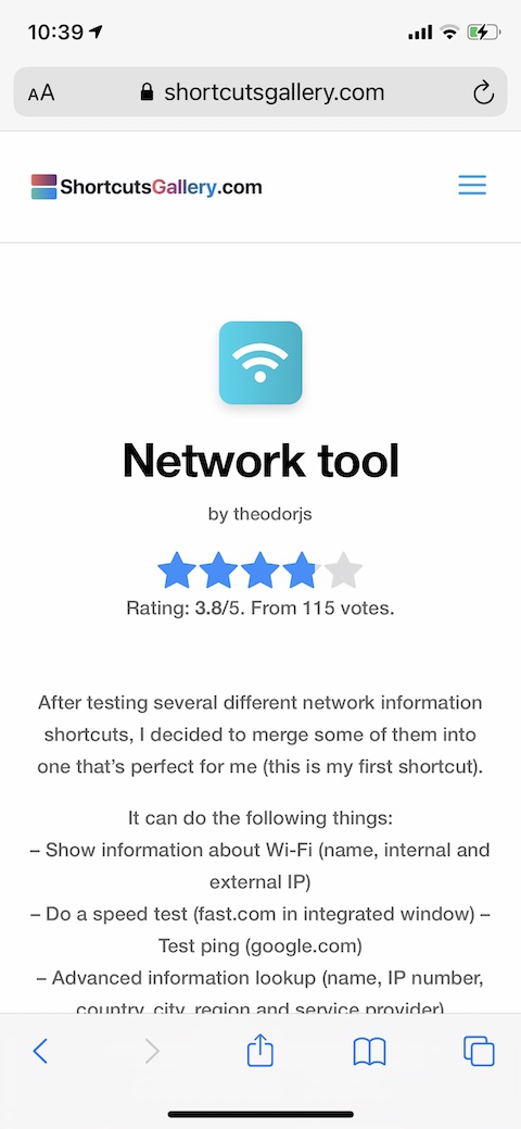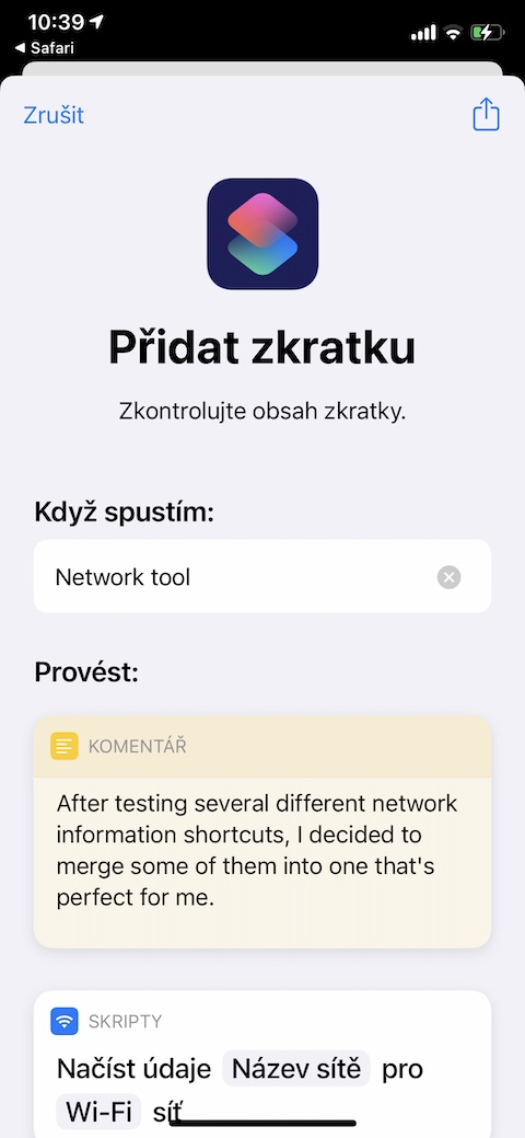Zkratku s názvem Network Tool jistě ocení všichni, kteří chtějí mít přehled o síťovém připojení. Tato informativní zkratka vám dokáže poskytnout údaje o názvu a IP vaší Wi-Fi sítě, provést test rychlosti, nebo třeba sdílet připojení k vaší Wi-Fi síti za pomoci QR kódu.