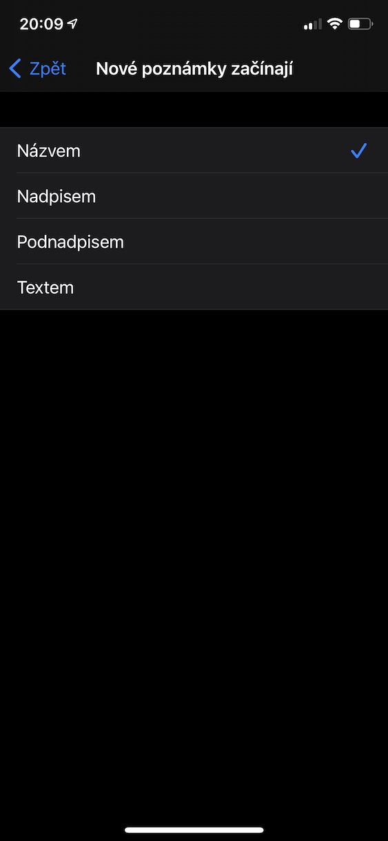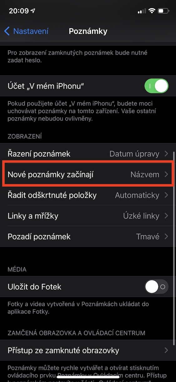 Pokud se rozhodnete pro vytvoření nové poznámky a začnete psát na první řádek, tak se tento text automaticky zformátuje jakožto nadpis celé poznámky. To samozřejmě nemusí naprosto všem uživatelům vyhovovat, a tak existuje jednoduchá možnost, díky které lze tuto předvolbu změnit. Stačí, když přejdete do Nastavení, kde otevřete kolonku Poznámky. Zde sjeďte o kus níže ke kategorii Zobrazení a rozklikněte Nové poznámky začínají. Nakonec si vyberte, čím mají nové poznámky začínat.