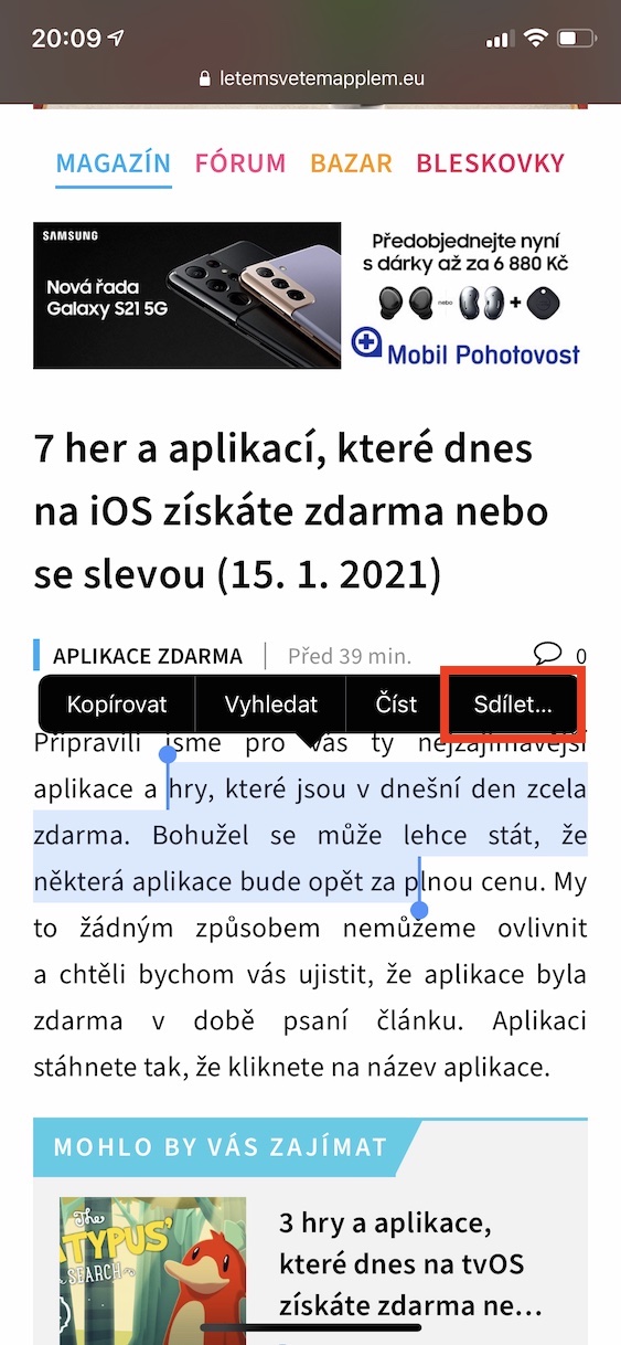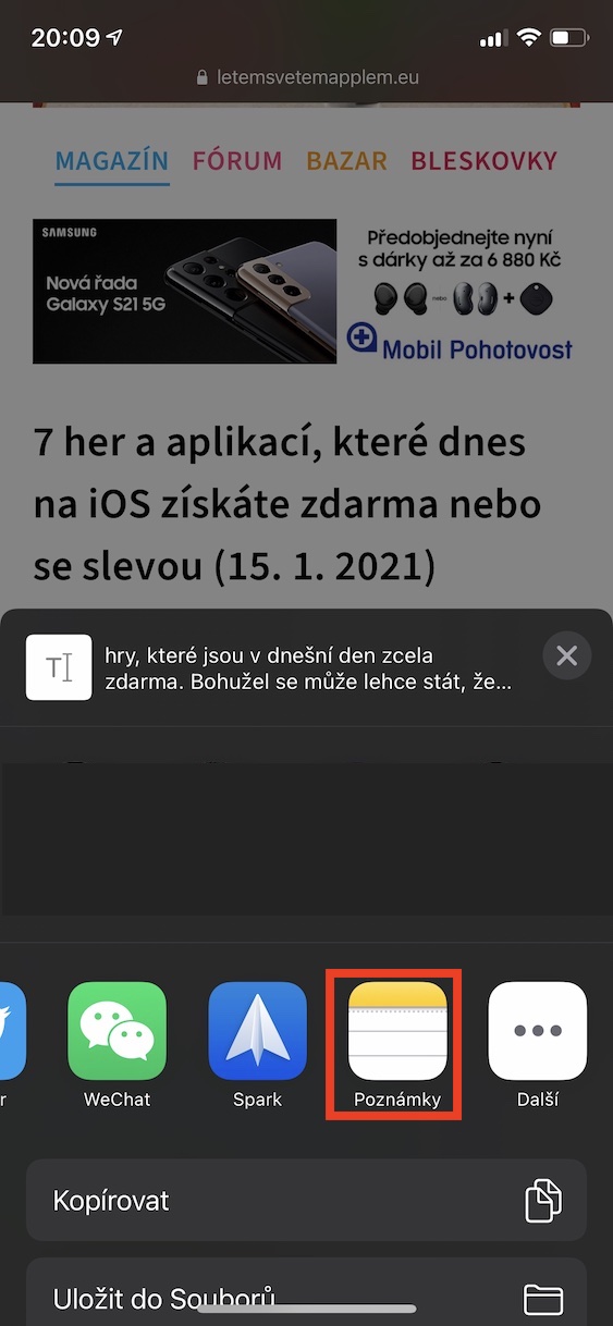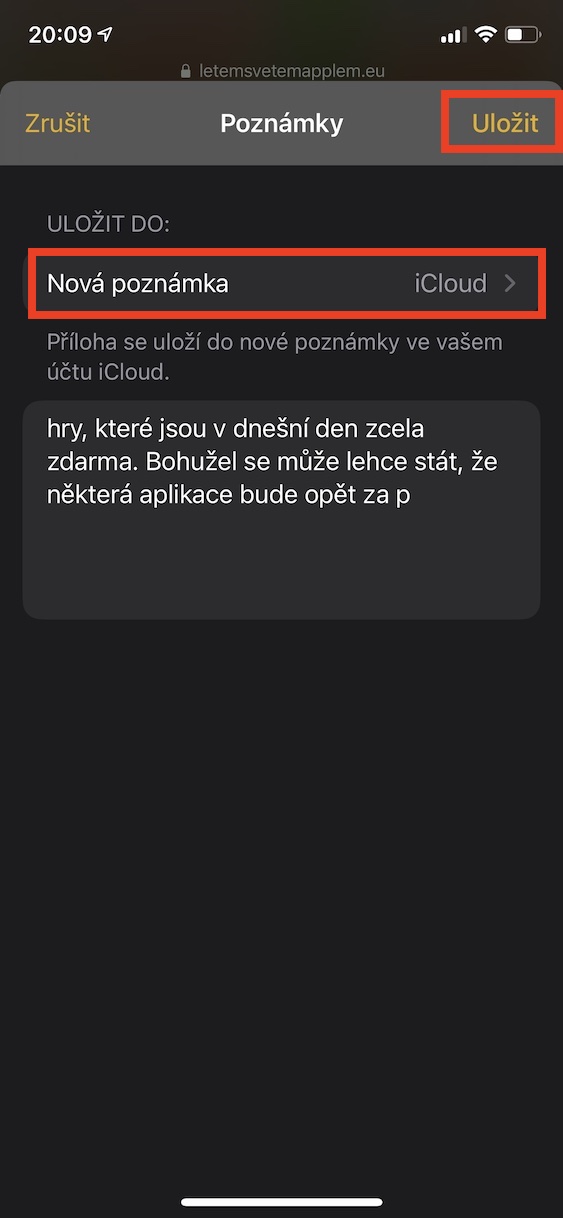 Věděli jste o tom, že můžete jednoduše z jakékoliv webové stránky uložit vybraný text přímo do Poznámek? Tato funkce funguje tak, že se prvně přesunete do Safari, kde přejdete na jakoukoliv webovou stránku. Jakmile tak učiníte, tak si vyberte nějaký text, který vás zajímá, a prstem si jej označte. Po dokončení označení klepněte v menu na tlačítko Sdílet…, čímž se obrazí menu sdílení. Zde stačí vybrat aplikaci Poznámky, poté vybrat konkrétní poznámku pro uložení, a nakonec klepnout na Uložit vpravo nahoře.