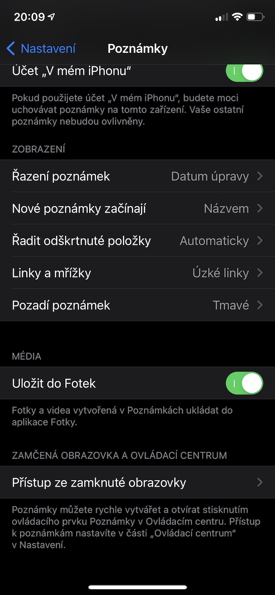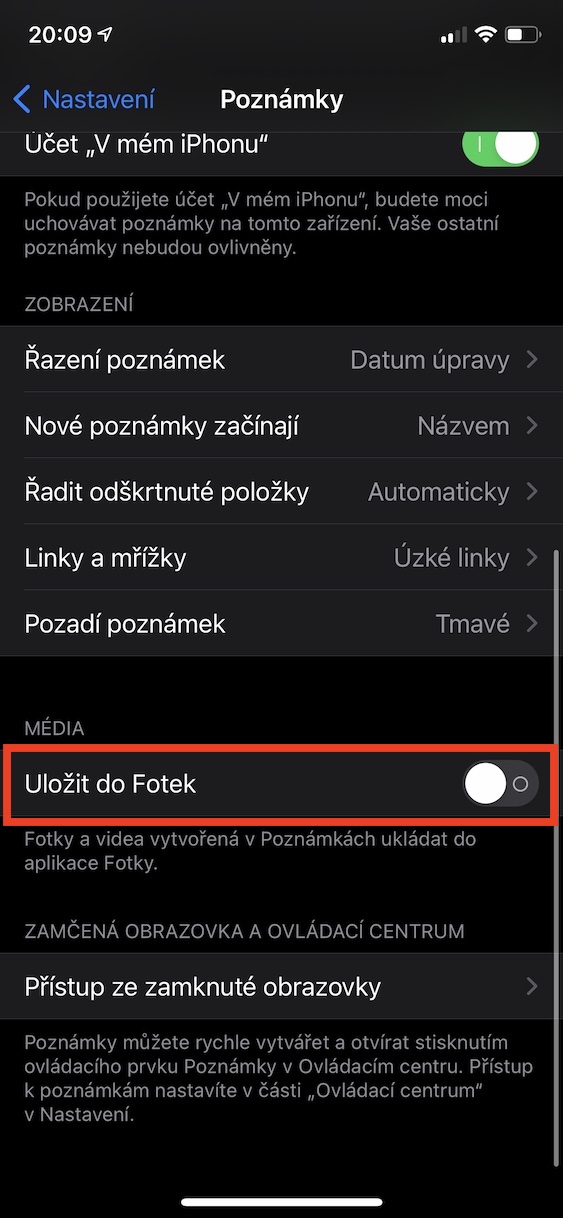 Kromě textu můžete do Poznámek vkládat samozřejmě také obrázky a různé fotografie. V tomto případě existují dvě možnosti, jak lze obrázky do poznámky přidat. Buď je importujete přímo z galerie aplikace Fotky, anebo si v Poznámkách otevřete fotoaparát a to, co potřebujete, vyfotíte. Ve výchozím nastavení se však takto vytvořené fotky (a videa) neuloží do Fotek, ale zůstanou jen v Poznámkách. Jakmile pak konkrétní poznámku smažete, tak o fotografii nadobro přijdete. Pokud si chcete aktivovat ukládání fotek z Poznámek do galerie, tak přejděte do Nastavení -> Poznámky, kde sjeďte níže a pomocí přepínače aktivujte možnost Uložit do Fotek.