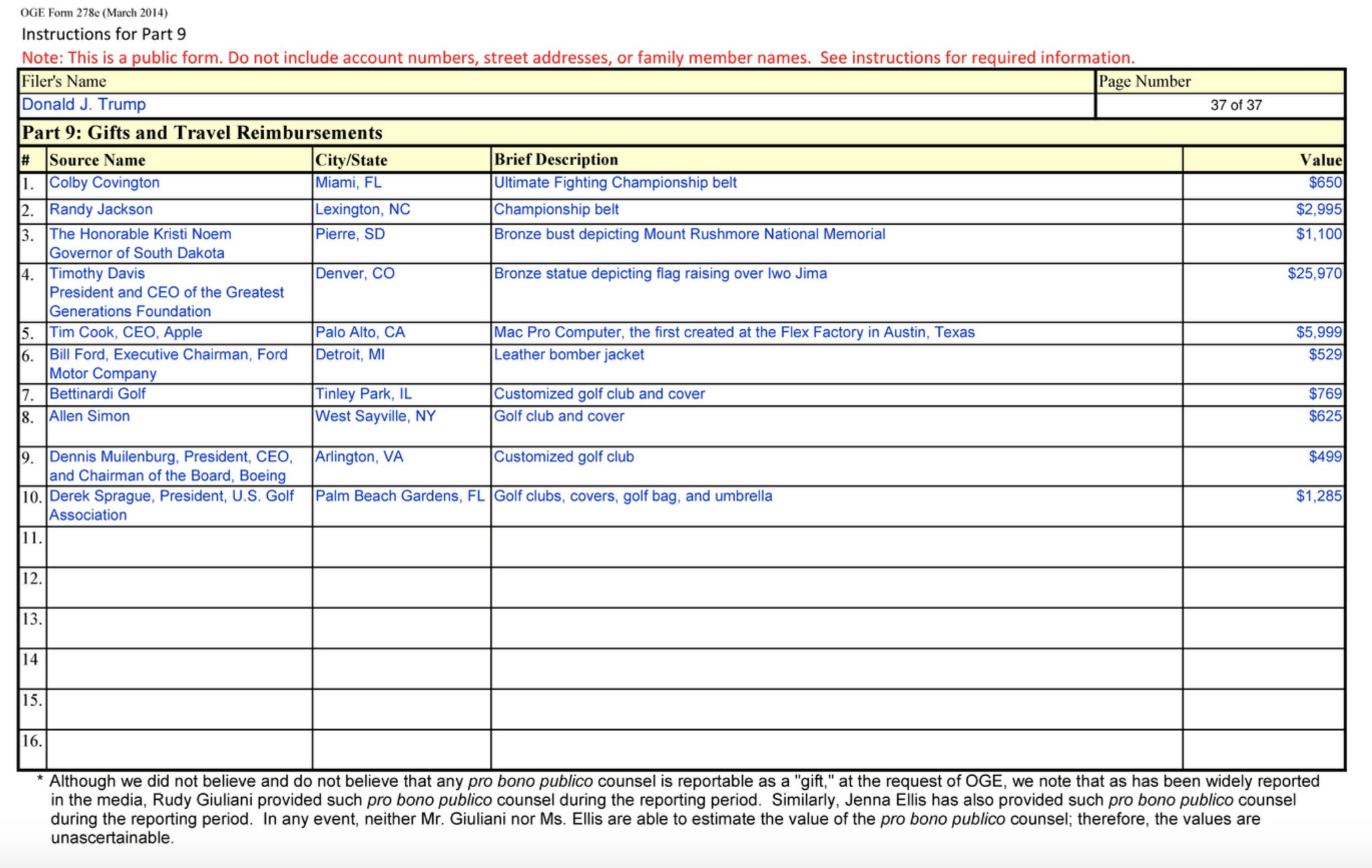 Poměrně zajímavé je, že podle seznamu darů, které Trump ve své funkci oficiálně obdržel, je Mac Pro (2019) “až” druhým nejhodnotnějším darem. Tím prvním je bronzová socha věnovaná organizací Greatest Generation Foundation. Na seznam darů se můžete podívat v tabulce níže.