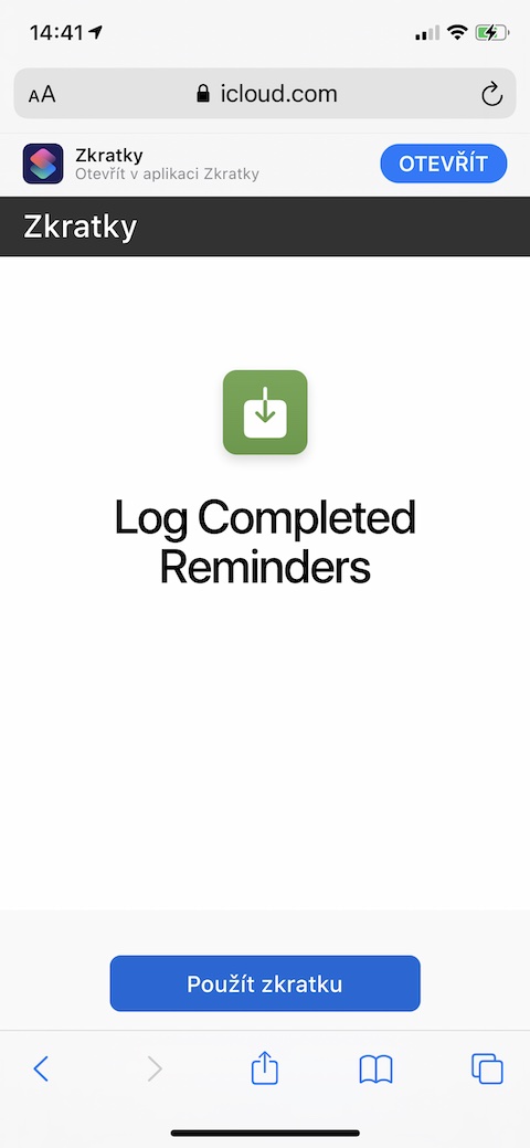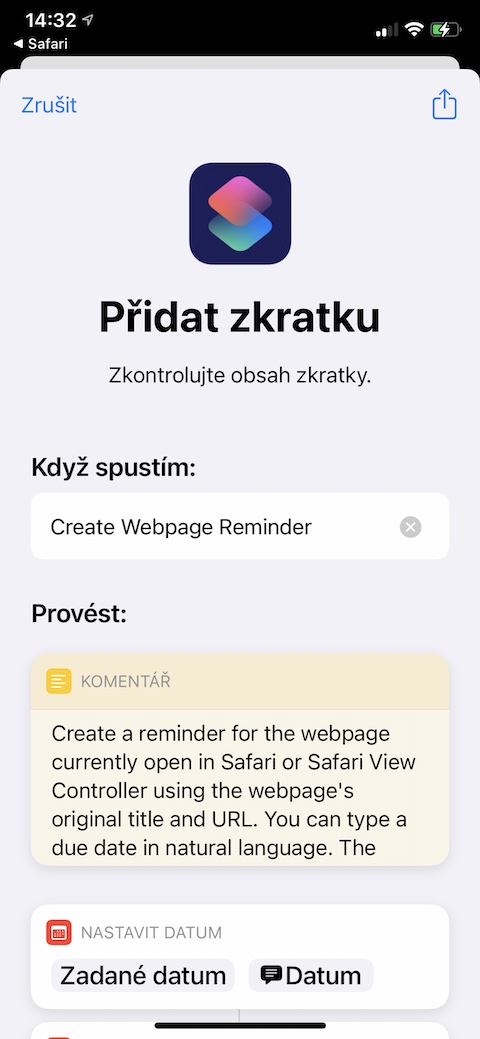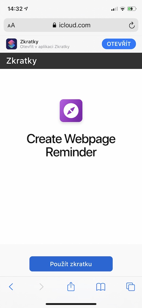 Tato zkratka vám umožní vytvořit připomínky pro jakoukoliv webovou stránku, kterou máte právě otevřenou v prohlížeči Safari nebo v prostředí Safari View Controller. Zkratku jednoduše aktivujete za pomoci příslušné ikonky v listu sdílení, původní URL dané webové stránky se do nově vytvořené připomínky uloží v podobě takzvaného rich linku.