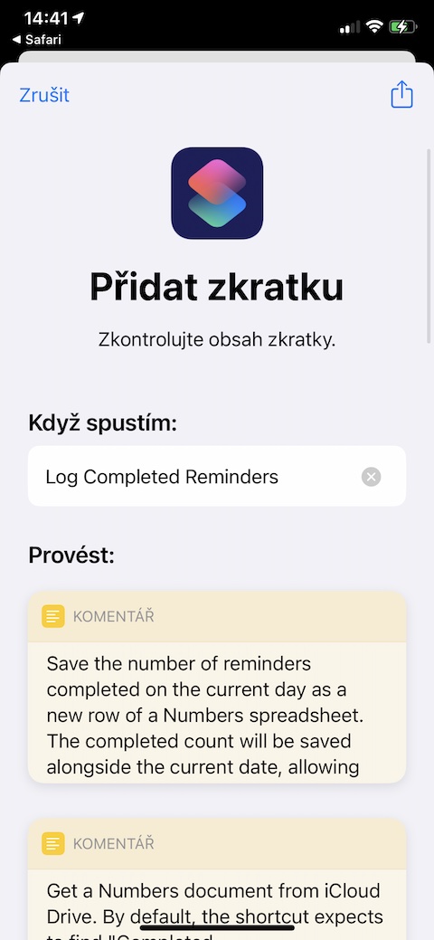 Podobně užitečná je také zkratka s názvem Log Completed Reminders. Ta vám umožní uložit údaj o počtu připomínek, které se vám podařilo v průběhu daného dne úspěšně vyřídit. Počet vyřízených připomínek bude automaticky uložen do tabulky v nativní aplikaci Numbers, ve které bude také docházet k průběžnému sčítání počtu vyřízených připomínek za daný den.