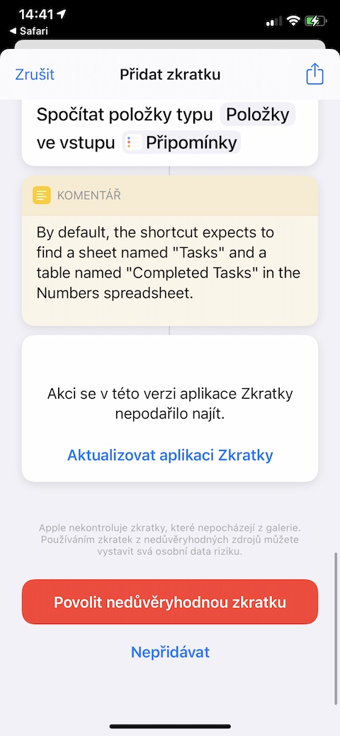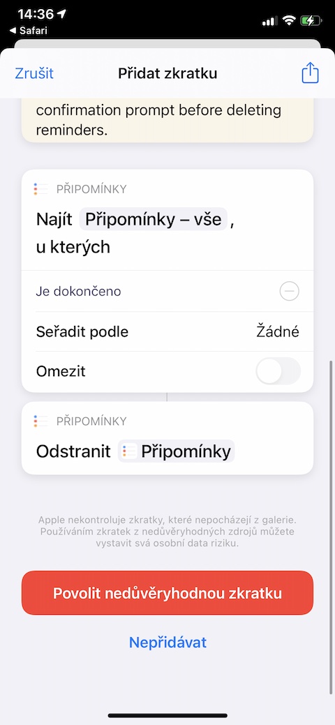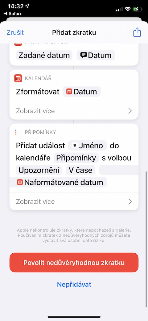 Než si kteroukoliv ze zde prezentovaných zkratek nainstalujete, ujistěte se, že jste na svém iPhonu či iPadu v Nastavení -> Zkratky aktivovali možnost používání nedůvěryhodných zkratek. Odkaz každé ze zkratek je zapotřebí otevřít v prostředí webového prohlížeče Safari v iOS nebo iPadOS zařízení, do kterého chcete danou zkratku nainstalovat.