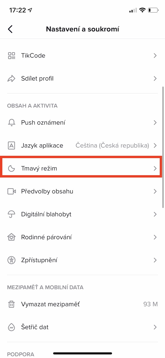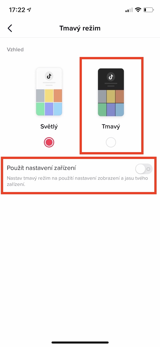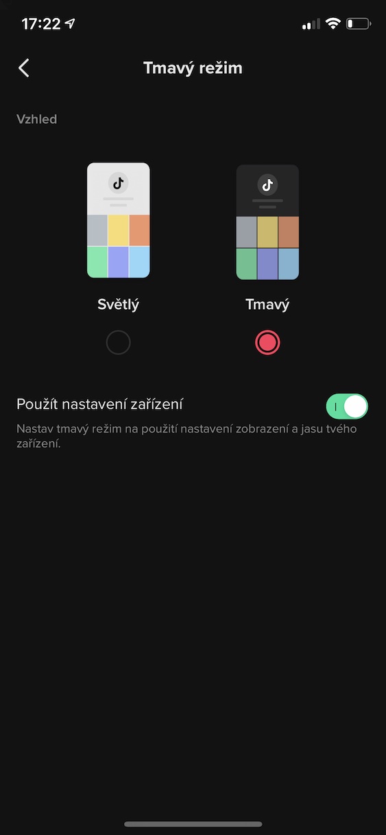 Ve výchozím nastavení aplikace TikTok je aktivní pouze světlý režim. Především k večeru a v noci tohle samozřejmě není ideální. Dobrou zprávou je, že TikTok disponuje i tmavým režimem. Ten si můžete nastavit buď „napevno“, anebo se může dynamicky měnit podle nastavení systému, což je pro většinu uživatelů ta nejlepší možnost. Pokud tedy chcete nastavit tmavý režim, popřípadě aby se režimy automaticky přepínaly, tak prvně ve spodním menu klepněte na záložku Já. Tímto se ocitnete na vašem profilu, kde vpravo nahoře klepněte na tři tečky, a poté se přesuňte níže do sekce Tmavý režim. Zde už můžete tmavý režim aktivovat, pro automatické přepínání režimu aktivujte možnost Použít nastavení zařízení.