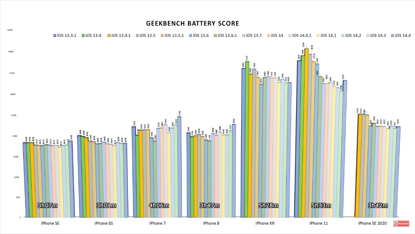 Hned úvodem je na místě říct, že skóre je u většiny testovaných iPhonů vyšší oproti iOS 14.3. U iPhonu SE 1. generace narostl počet bodů ze 1775 na 1870. K žádné změně ovšem nedošlo u iPhonu 6s, který si drží skóre shodné s iOS 14.3, tedy 1810 bodů. Největší nárůst za poslední dobu sledujeme u iPhonu 7 díky vyslouženým 2454 bodům. Na iOS 14.3 tento model obdržel 2254 bodů. Růst sledujeme i na iPhonu 8, jenž si polepšil z 2115 na 2268. Téměř shodné skóre zůstává u iPhonu XR, který si od iOS 14.3, kde si vysloužil 3257 bodů, si polepšil jen o pouhých 9. Podstatně lépe se dařilo iPhonu 11. Ten si dokázal polepšit z 3063 na 3315, což je opravdu fajn. Vyšší bodové ohodnocení v tomto testu lze spatřit i u iPhonu SE 2. generace, který si odnáší 2215 oproti 2179. Za sebe musím říct, že se mi výdrž baterie zdá oproti předchozí aktualizaci opravdu o něco lepší. Jak jste na tom vy?